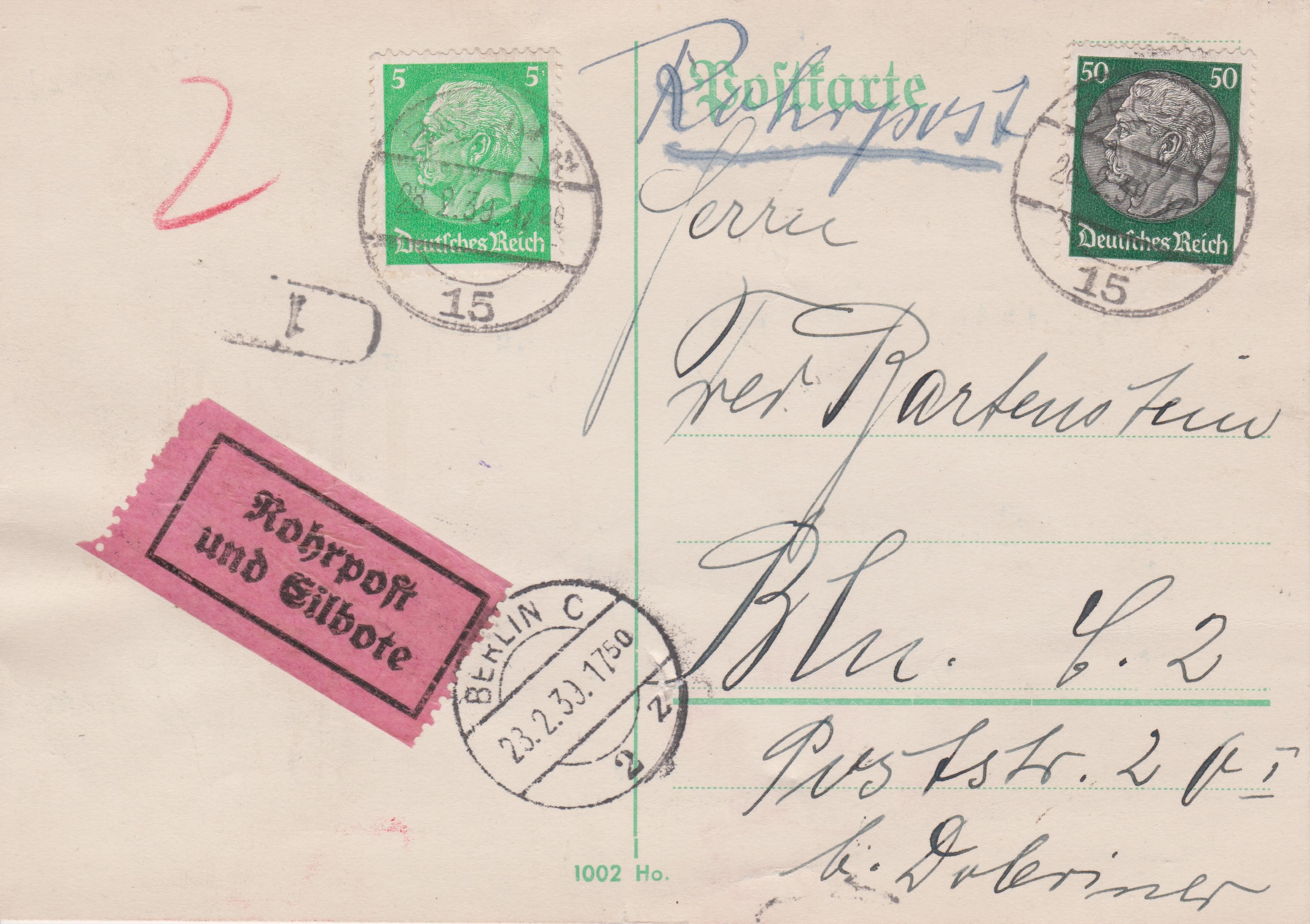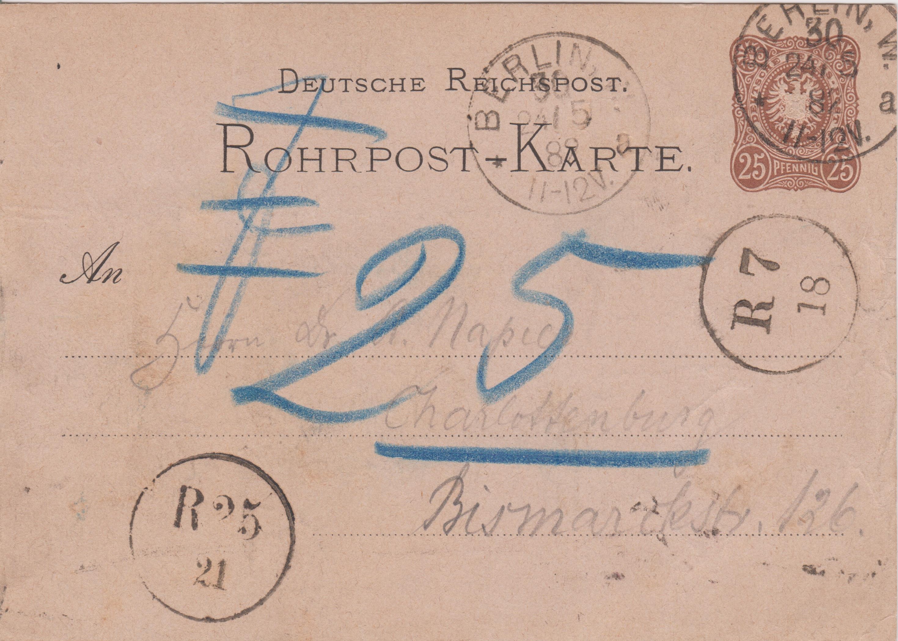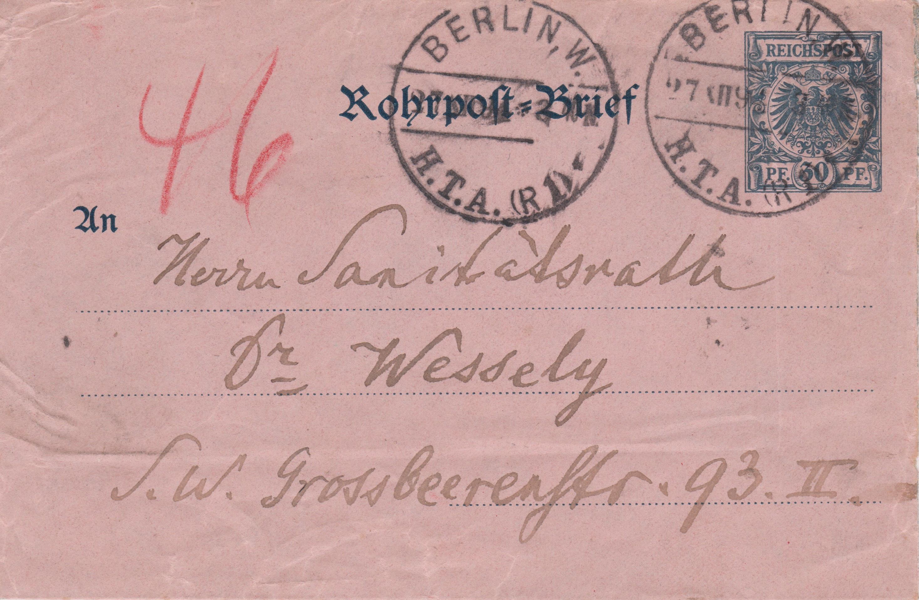 Ganzsache Deutsches Reich "Rohrpost-Brief", MiNr. RU 6, aufgegeben in "BERLIN, W. H.T.A. (R 1)", handschriftlicher Leitvermerk der Rohrpost in Rot "46", befördert per Berliner Rohrpost: