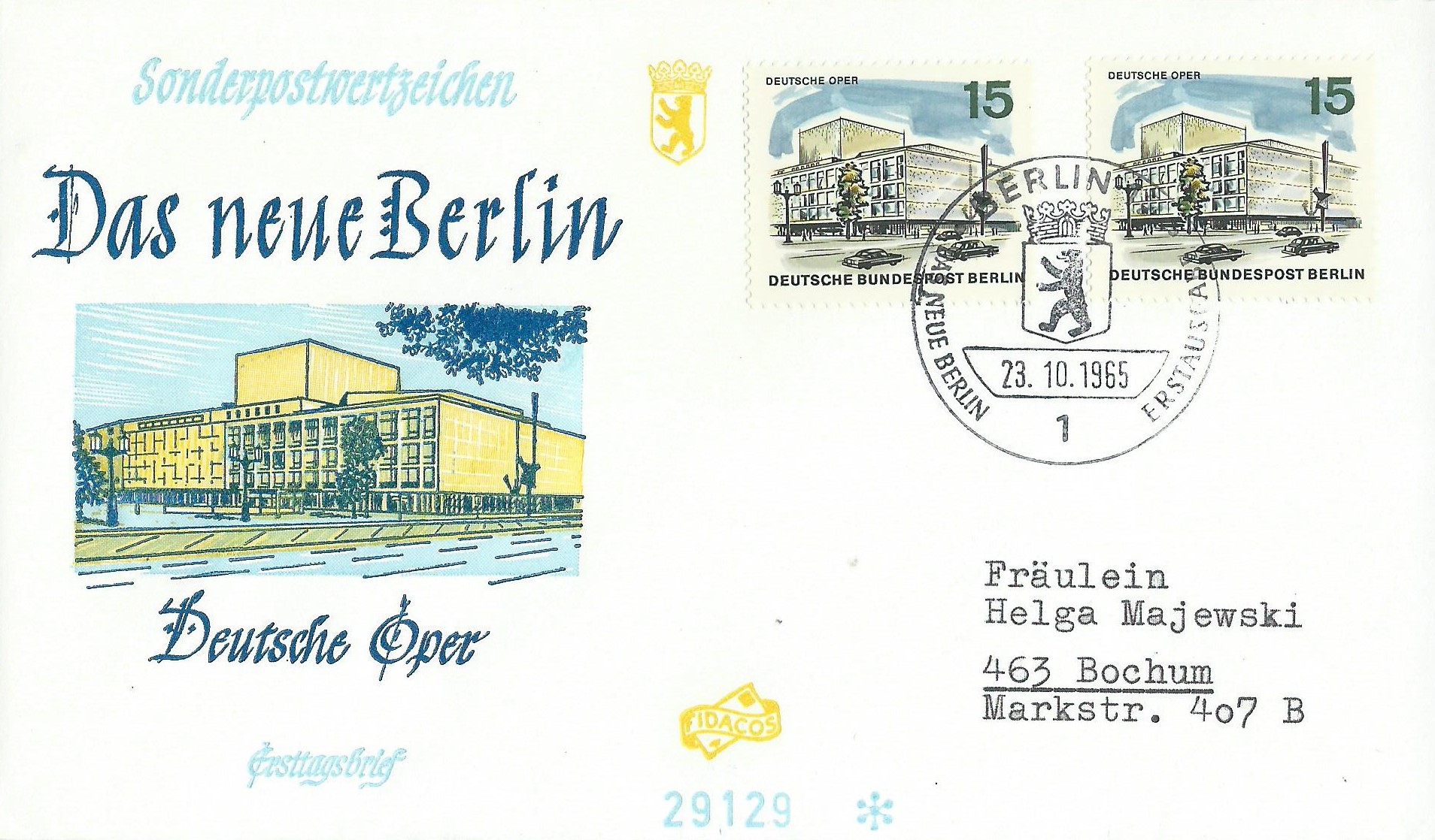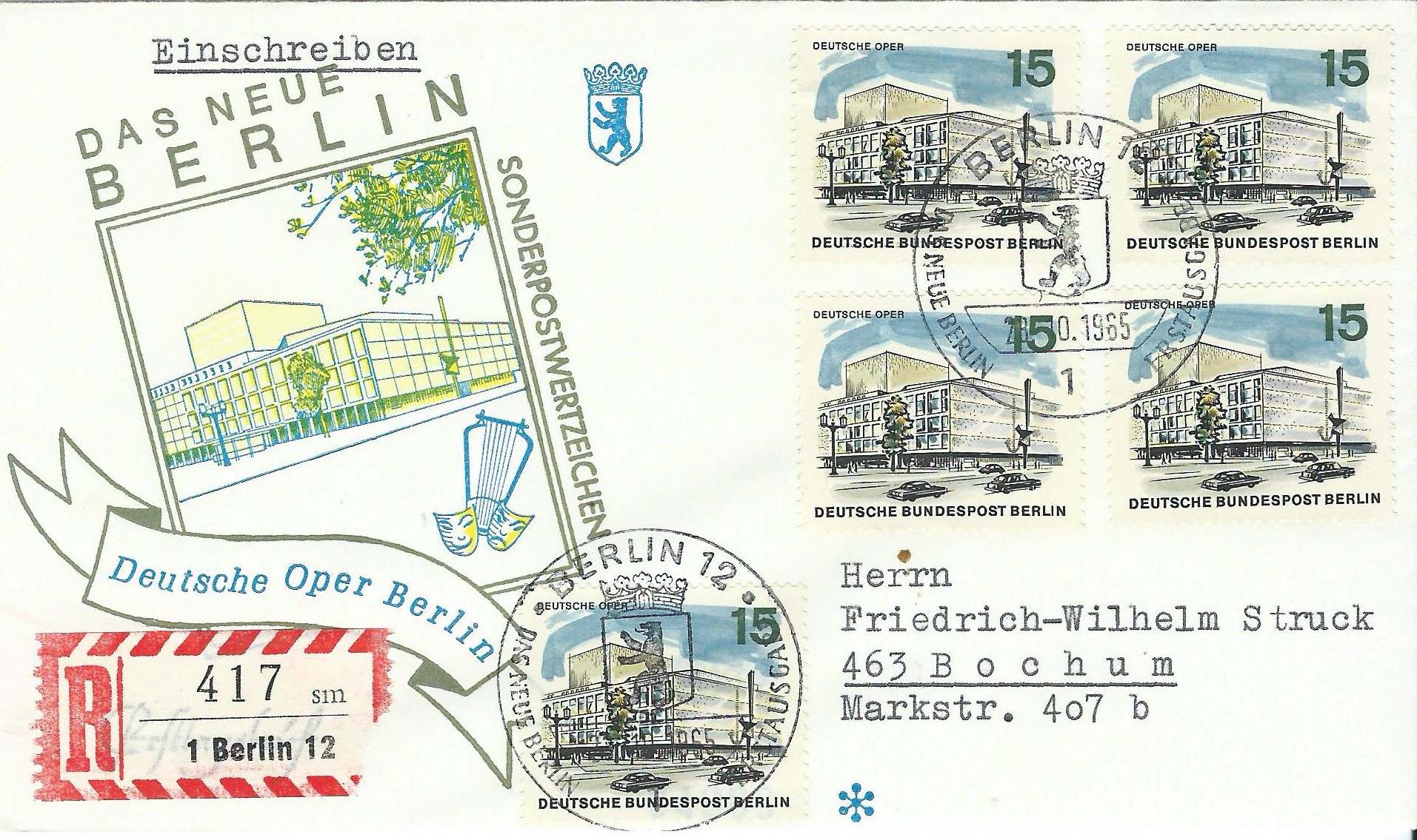 Beginnen wir mit dem Wert zu 10 Pf Kaiser-Wilhelm-Gedächtniskirche. Auf diesem Beleg klebt der Wert 2 Mal als Einzelmarke und wurde mit dem Ersttagssonderstempel Berlin am 28.8.65 gestempelt.