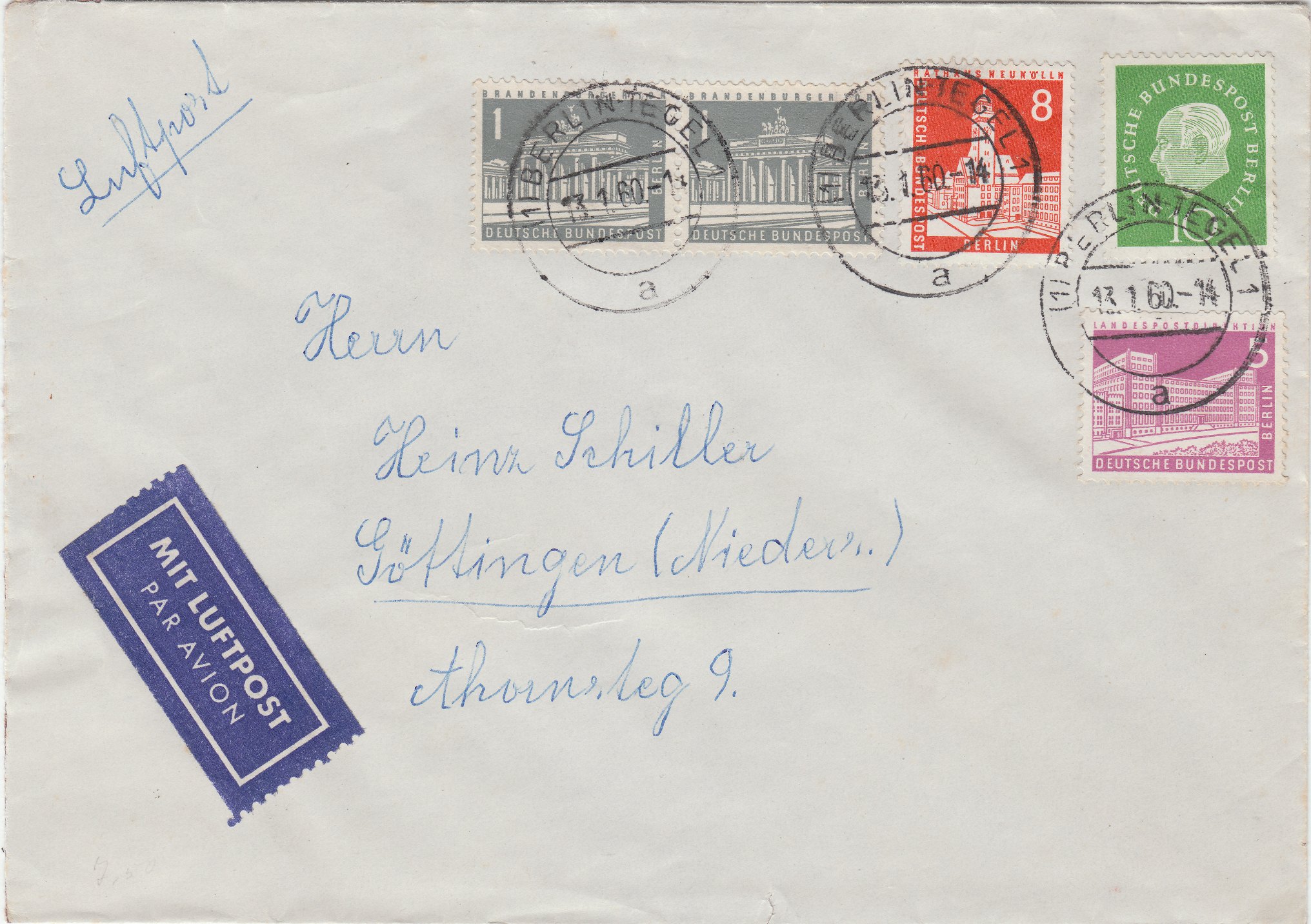 Brief (20 Pf) per Luftpost (5 Pf) am 13.01.1960 aufgegeben in Berlin Tegel, adressiert nach Göttingen, also per Luftpost gelaufen von Berlin bis Hannover: