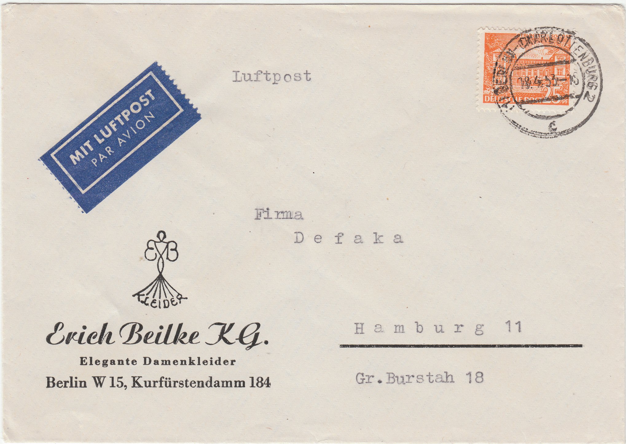 Brief (20 Pf) per Luftpost (5 Pf), frankiert per EF Berlin MiNr. 50 am 18.04.1953 aufgegeben in Berlin-Charlottenburg 2, adressiert nach Hamburg, also per Luftpost gelaufen von Berlin bis Hamburg: