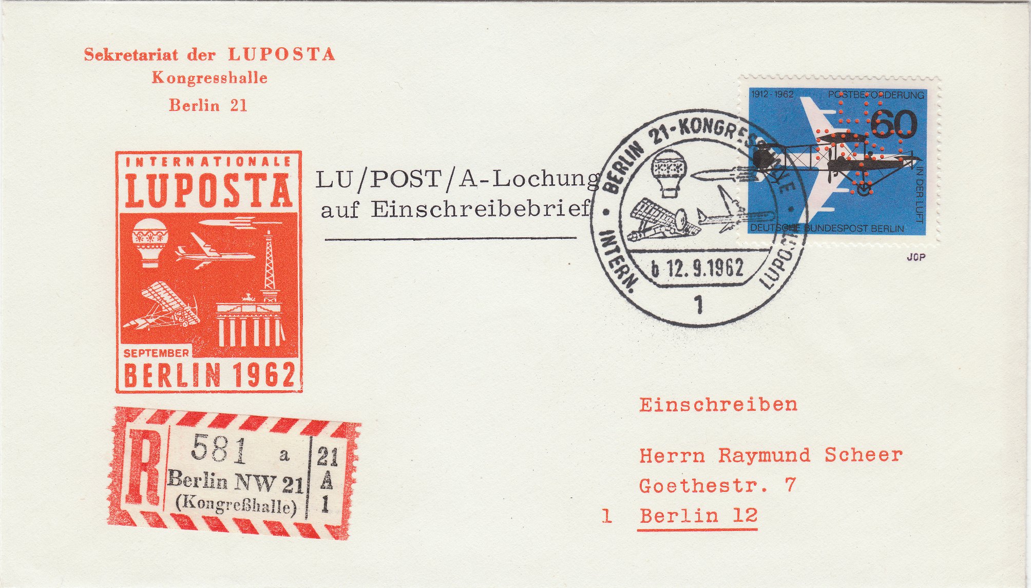 Zur Werbung für die Internationale Luftpostmarkenausstellung LUPOSTA 1962 in Berlin wurden 24.500 Stück dieses Postwertzeichens von der Ausstellungsleitung mit "LU / POST / A" dreizeilig durchlocht und verkauft.