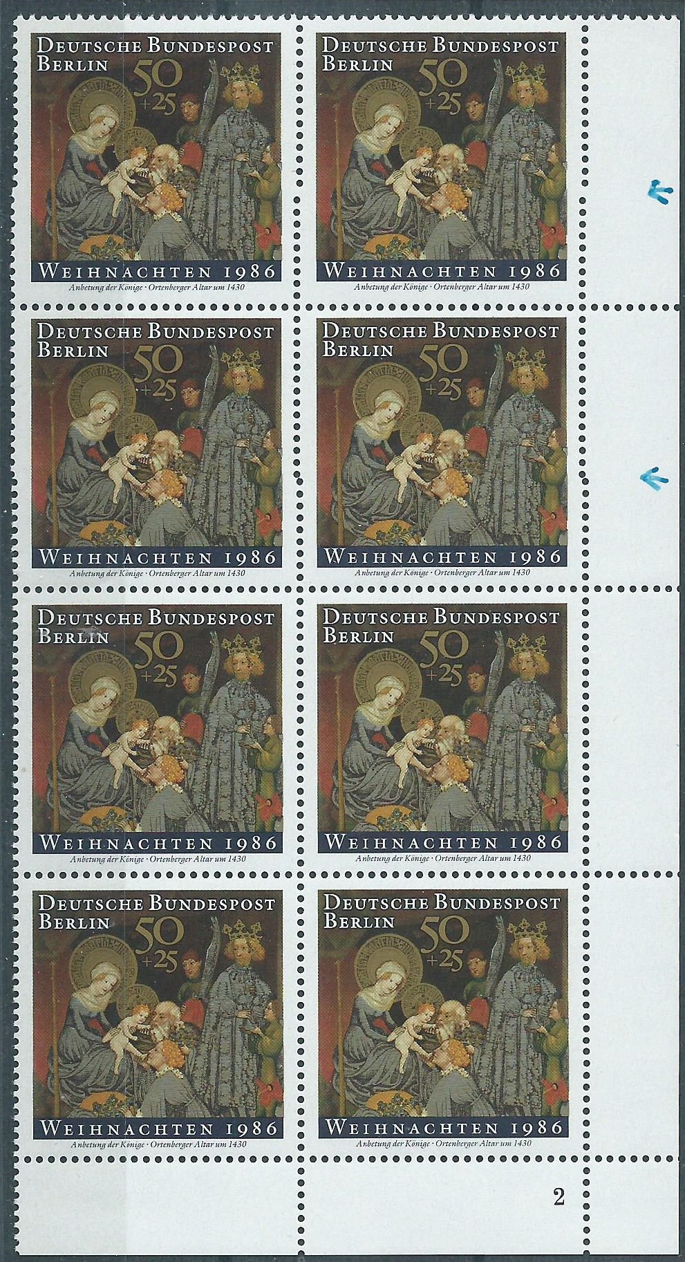 von der Weihnachtsmarke Berlin von 1986 habe ich vor längerer Zeit einen postfrischen senkrechten 8-er-Block aus der rechten unteren Bogenecke erhalten können, der eine markante Verzahnung aufweist. Dieses wurde von einem Vorbesitzer leider auch durch Pfeile am Bogenrand mit einem Farbstift gekennzeichnet. Hier scheint über 2 Marken der Zähnungskamm einen Tick nach links versetzt worden zu sein. Diese Art der Verzahnung ist nur von ganz wenigen Sondermarken bekannt. Mir ist das Stück vor Jahren auf einem Flohmarkt aufgefallen und ich habe es für ganz kleines Geld im Rahmen einer Dublettensammlung erwerben können. Hier trifft wieder unser bekannter Spruch zu: Augen auf bei Tausch und Kauf!