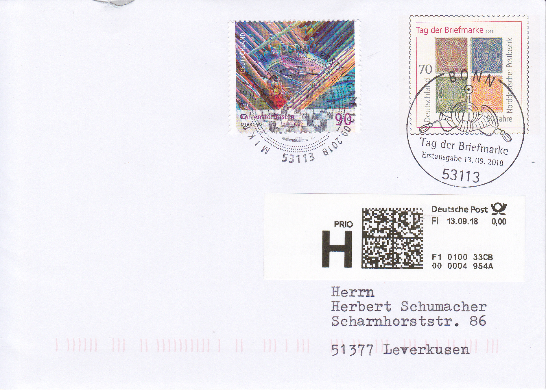 Dieser Blankoumschlag mit einem Wertzeicheneindruck im Muster der Marke zum Tag der Briefmarke 2018 wurde am Ausgabetag als Priobrief mit dem Ersttagsonderstempel verschickt. Die Zusatzgebühr für den Priobrief wurde mit der Marke zu 90 Cent "Kohlenstofffasern" aus der Serie "Microwelten" entrichtet. Diese Marke ist am gleichen Tag erschienen und mit dem passenden Ersttagsonderstempel Bonn gestempelt worden.