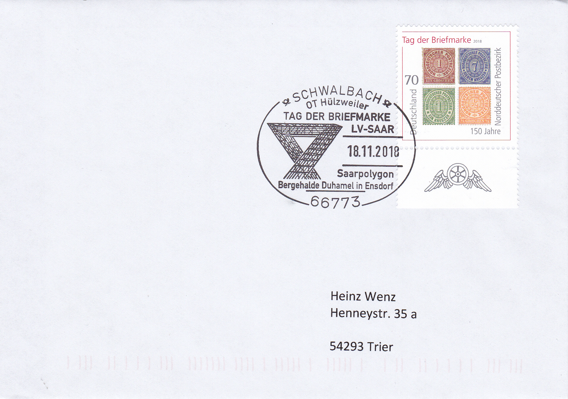 Sonderstempel aus Schwalbach vom 18.11.2018 zum Tag der Briefmarke 2018 des LV Saar.