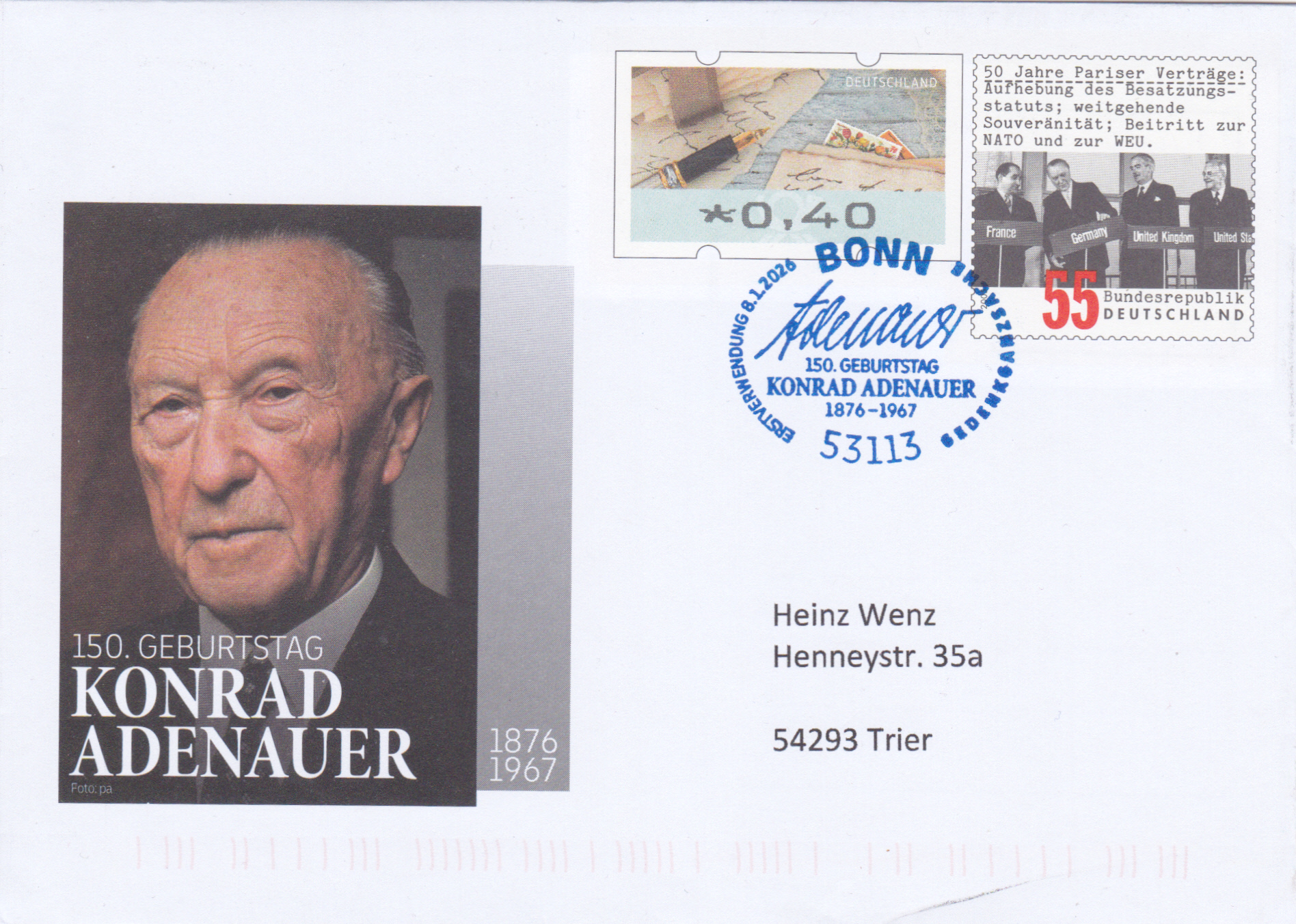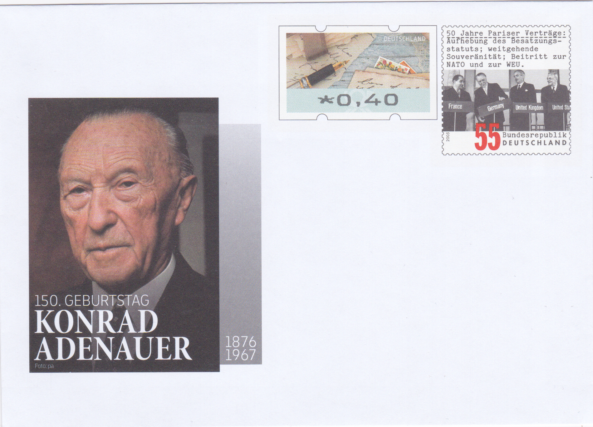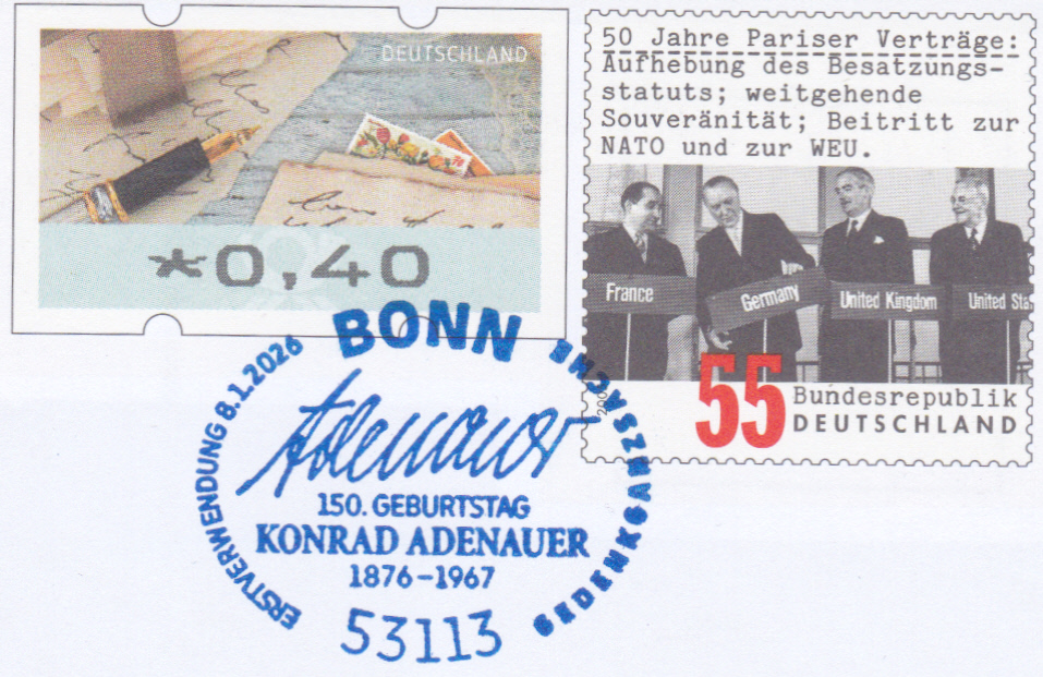 Zum 150. Geburtstag von Konrad Adenauer ist bei der Deutschen Post ein Gedenkumschlag mit je einem Wertstempel der Marke "50 Jahre Pariser Verträge" (MiNr 2459) und einer Automatemarke zu 0,40€ (MiNr ATM 9) erschienen.