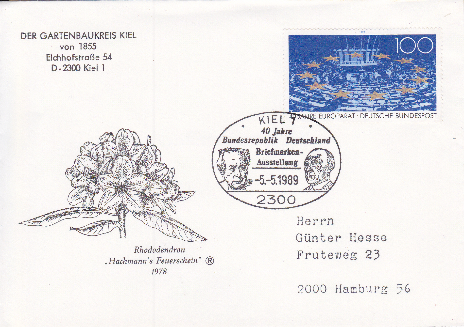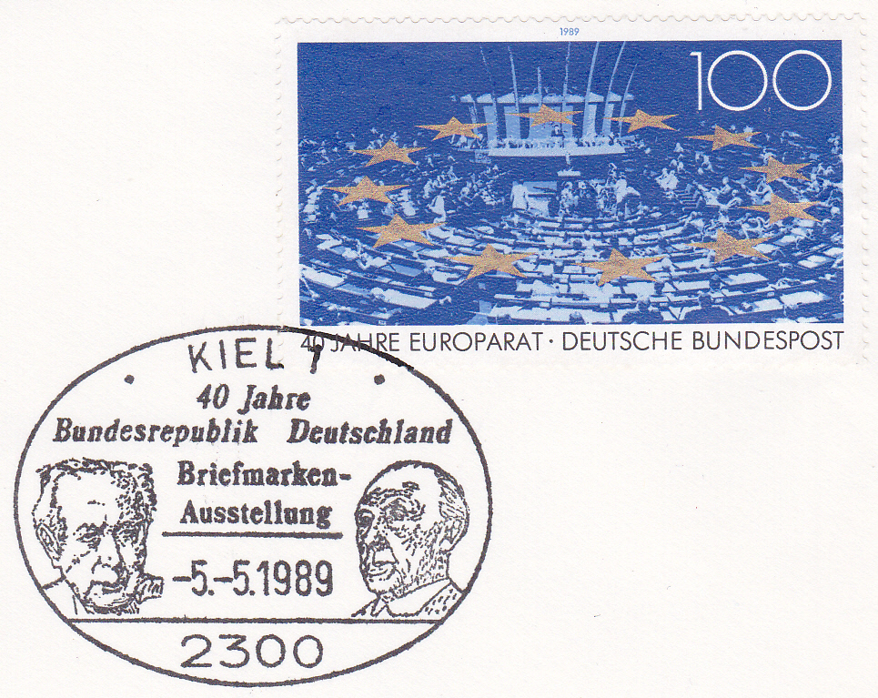 Der Sonderstempel "40 Jahre Bundesrepublik Deutschland" vom 5.5.1999 aus Kiel zeigt Konrad Adenauer und Theodor Heuss im Stempelbild.