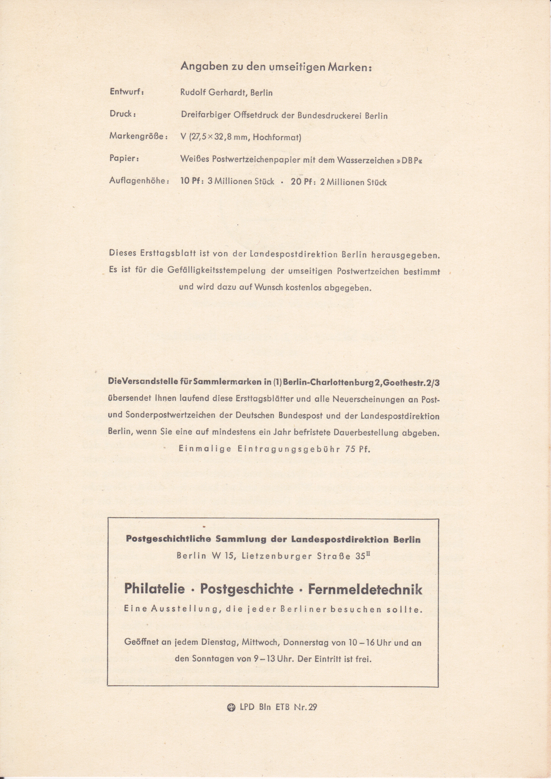 Hier zeige ich die Vorder- und Rückseite des ETB (MiNr ETB 29) mit den beiden Marken. Das ETB wurde am Ausgabetag der Marken mit dem Tagesstempel aus Berlin BW40 Kongresshalle gestempelt.