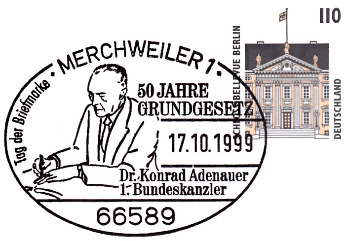Ganzsache des Landesverbandes der Briefmarkensammler des Saarlandes mit dem passenden Sonderstempel vom 17.10.1999 aus Merchweiler zum Tag der Briefmarke 1999. Im Stempelbild sehen wir Konrad Adenauer.