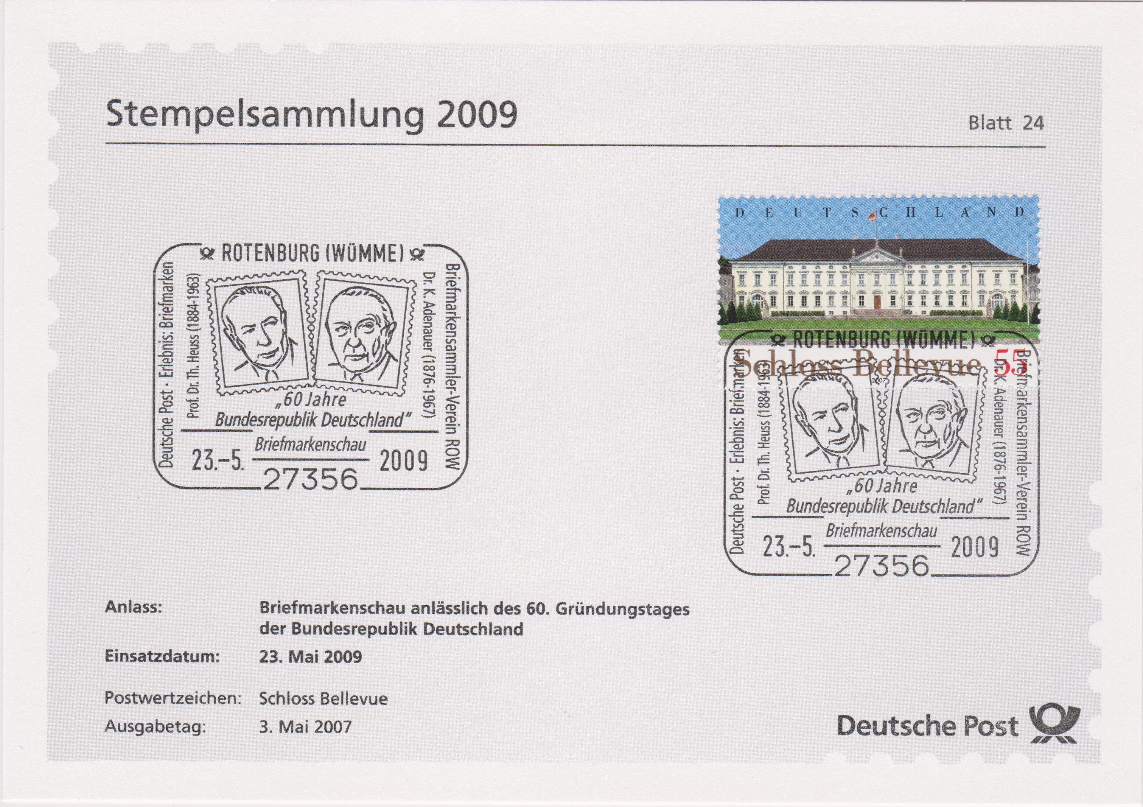 Dieses "Blatt 24" der "Deutsche Post Stempelsammlung 2009" zeigt "Dr. K. Adenauer" auf einem Sonderstempel aus 27356 ROTENBURG (WÜMME) aus Anlass "60 Jahre Bundesrepublik Deutschland":