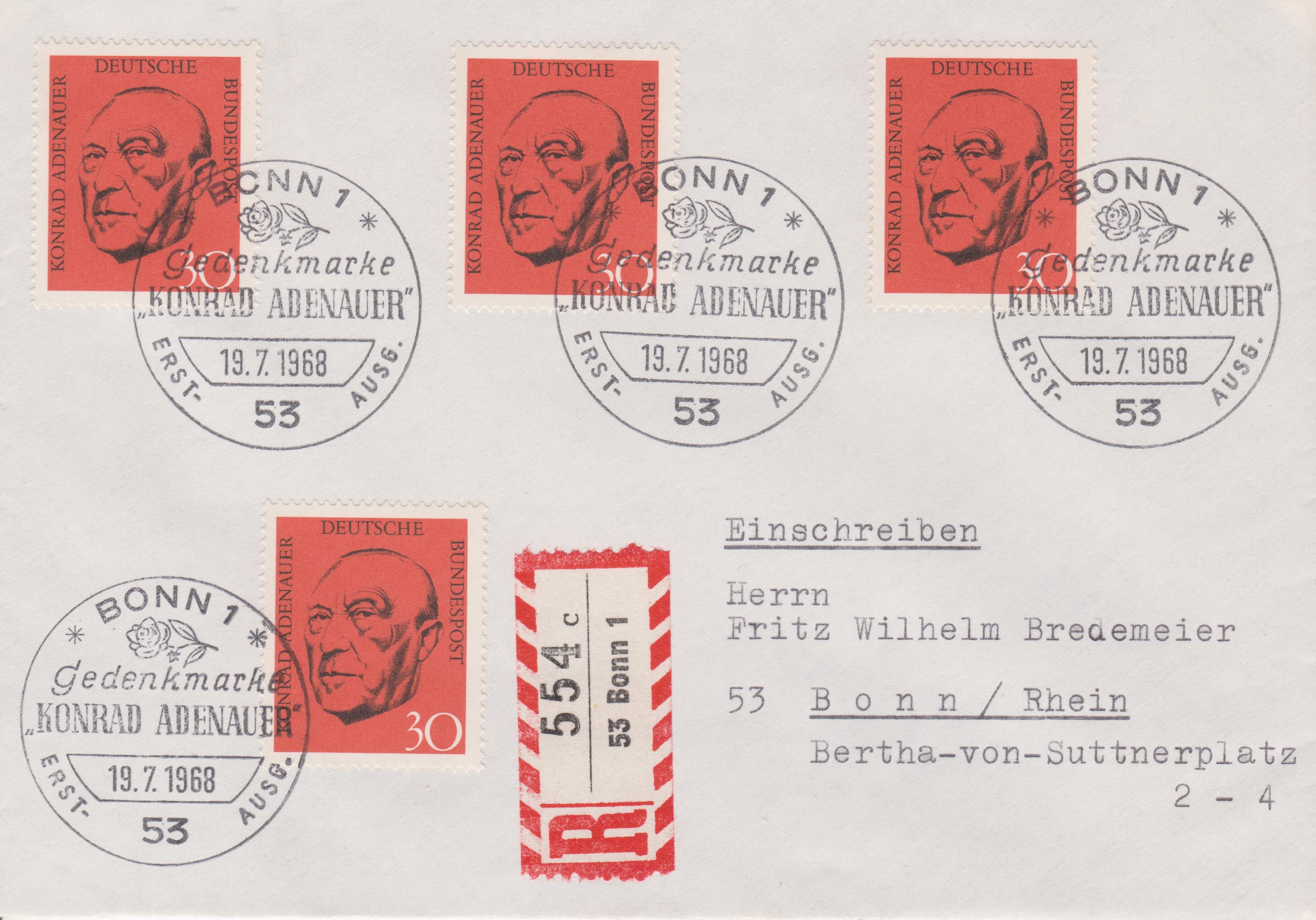 Zum 1. Todestag von Konrad Adenauer erschien am 19.07.1968 Deutschen Bundespost MiNr 567 mit seinem Porträt, hier vier Exemplare als Mehrfachfrankatur auf Brief per Einschreiben mit ESST 53 BONN 1: