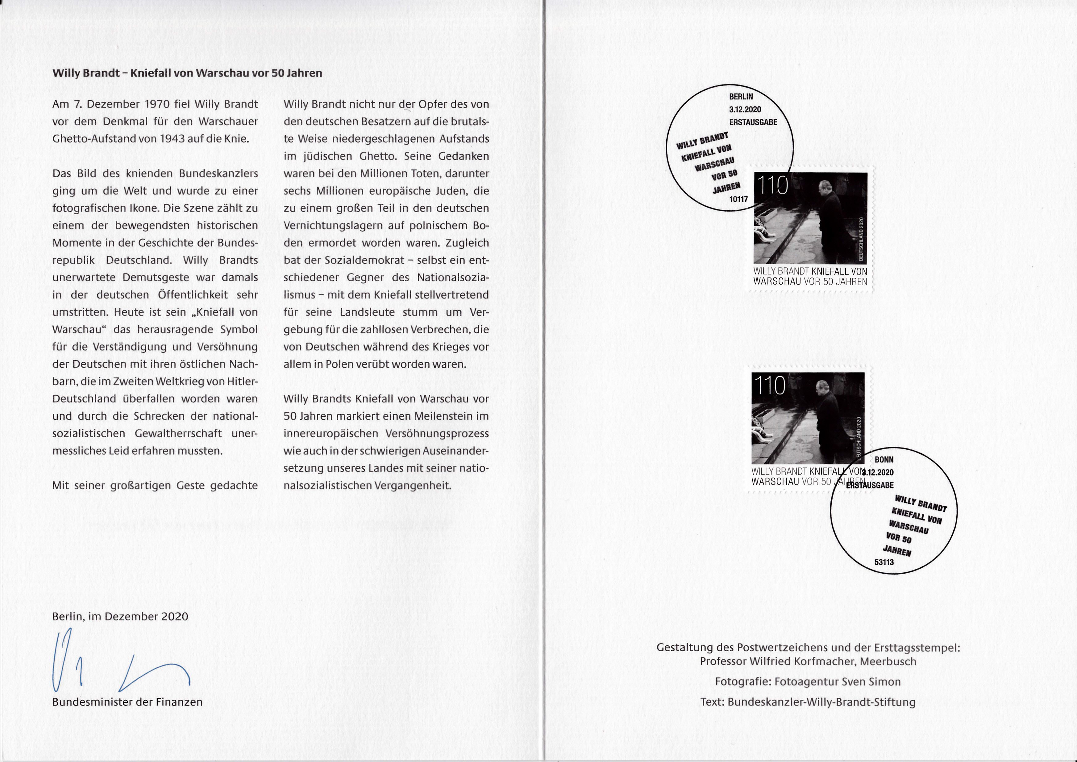 Ministerkarte des Finanzministers mit zwei Marken zum 50. Jahrestag des Kniefalls von Warschau (MiNr 35679) und mit den Ersttagsonderstempel Berlin und Bonn.