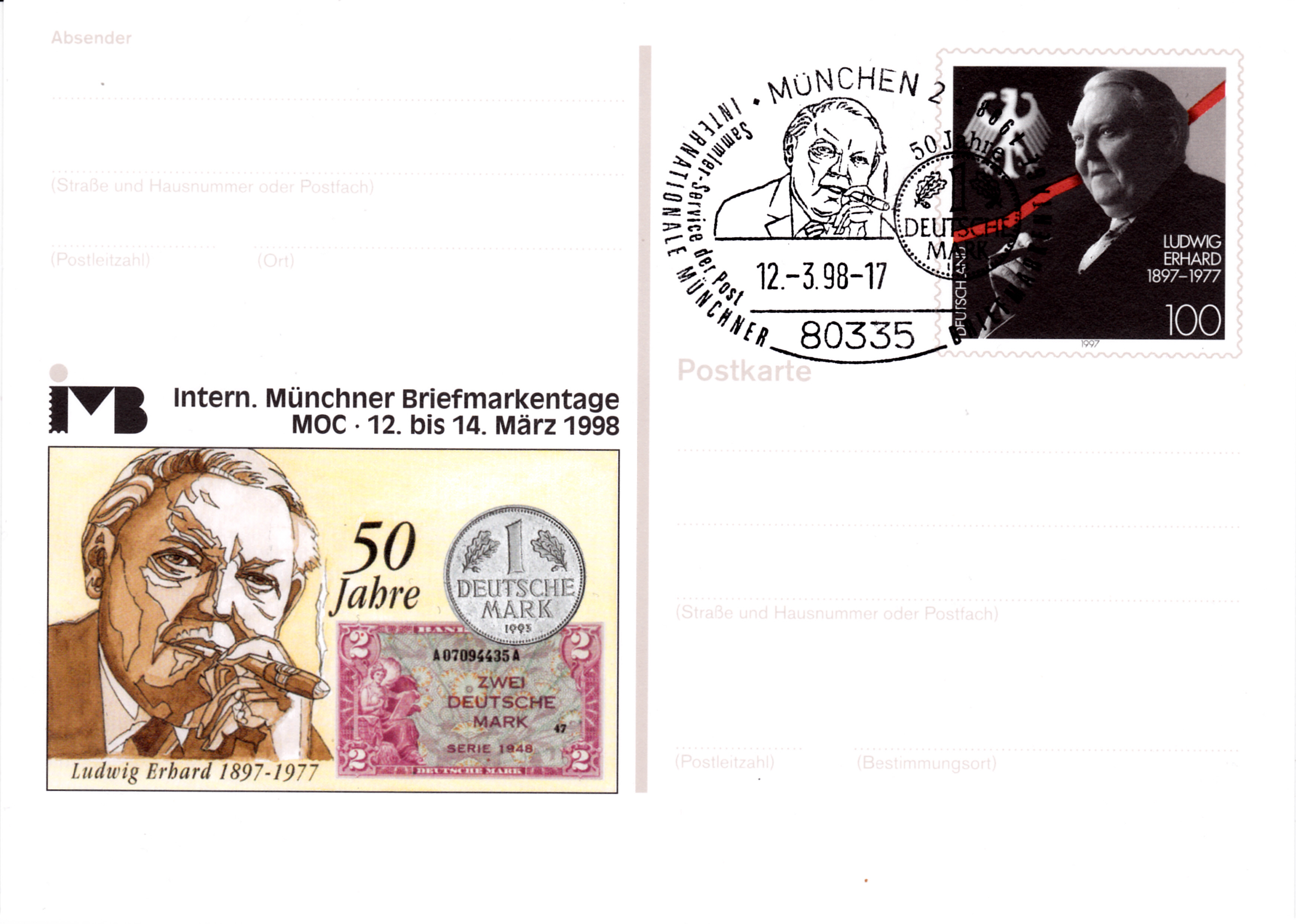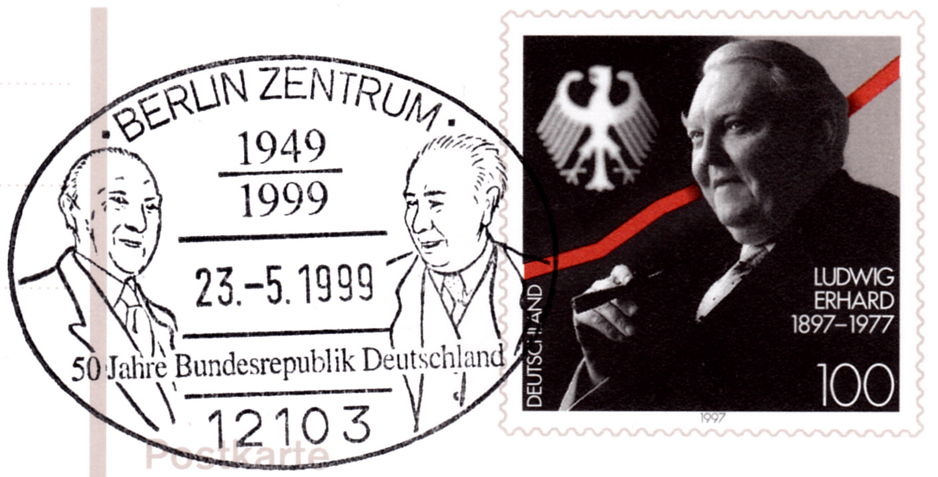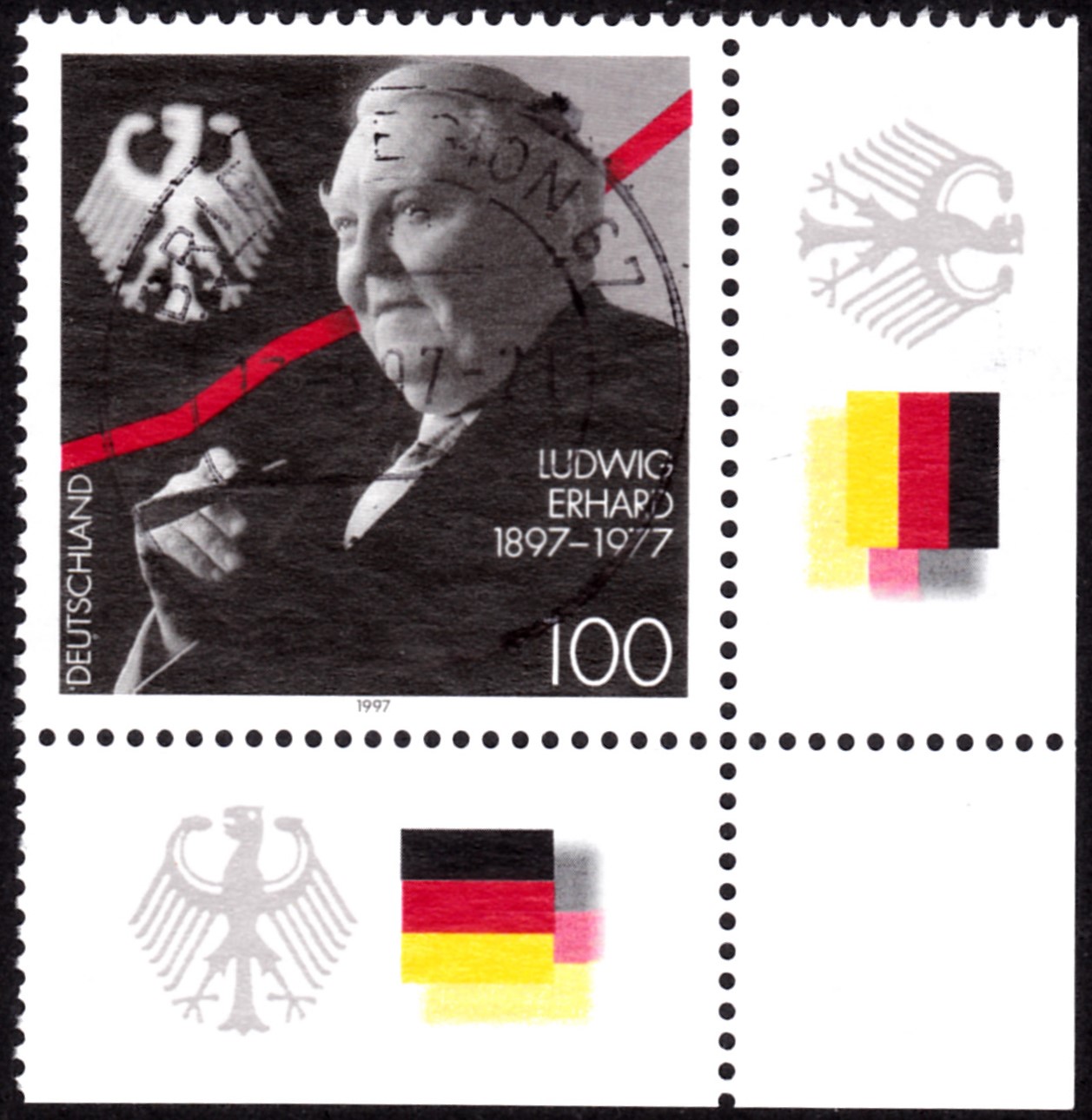 Zum 100. Geburtstag von Dr. Ludwig Erhard ist bei der Deutschen Post eine Marke (MiNr 1904) mit seinem Porträt erschienen. Hier ein Eckrandstück dieser Marke: