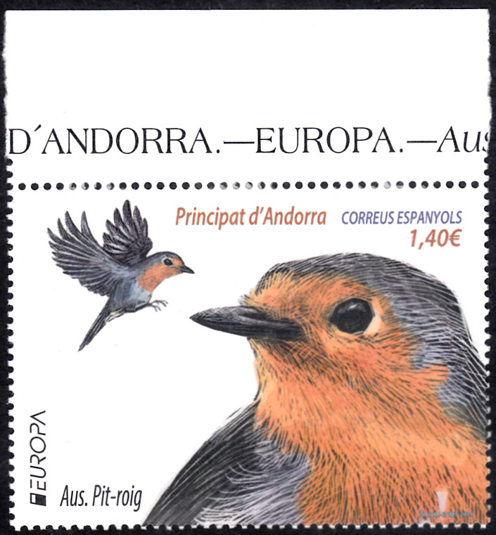 Eine Europamarke 2019 ist bei der spanischen Post in Andorra am 26. April 2019 zum Gemeinschaftsthema "Einheimische Vögel" erschienen. Hier zeige ich die Marke zu 1,40 Euro mit zwei Rotkehlchen (Erithacus rubecula). Die Auflage dieser Marke betrug 60.000 Stück.