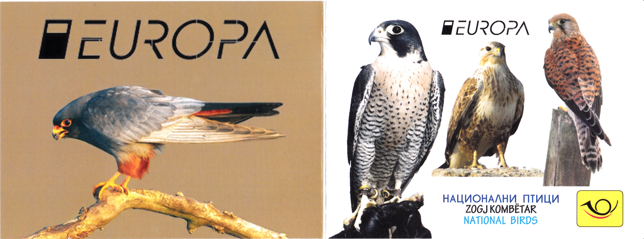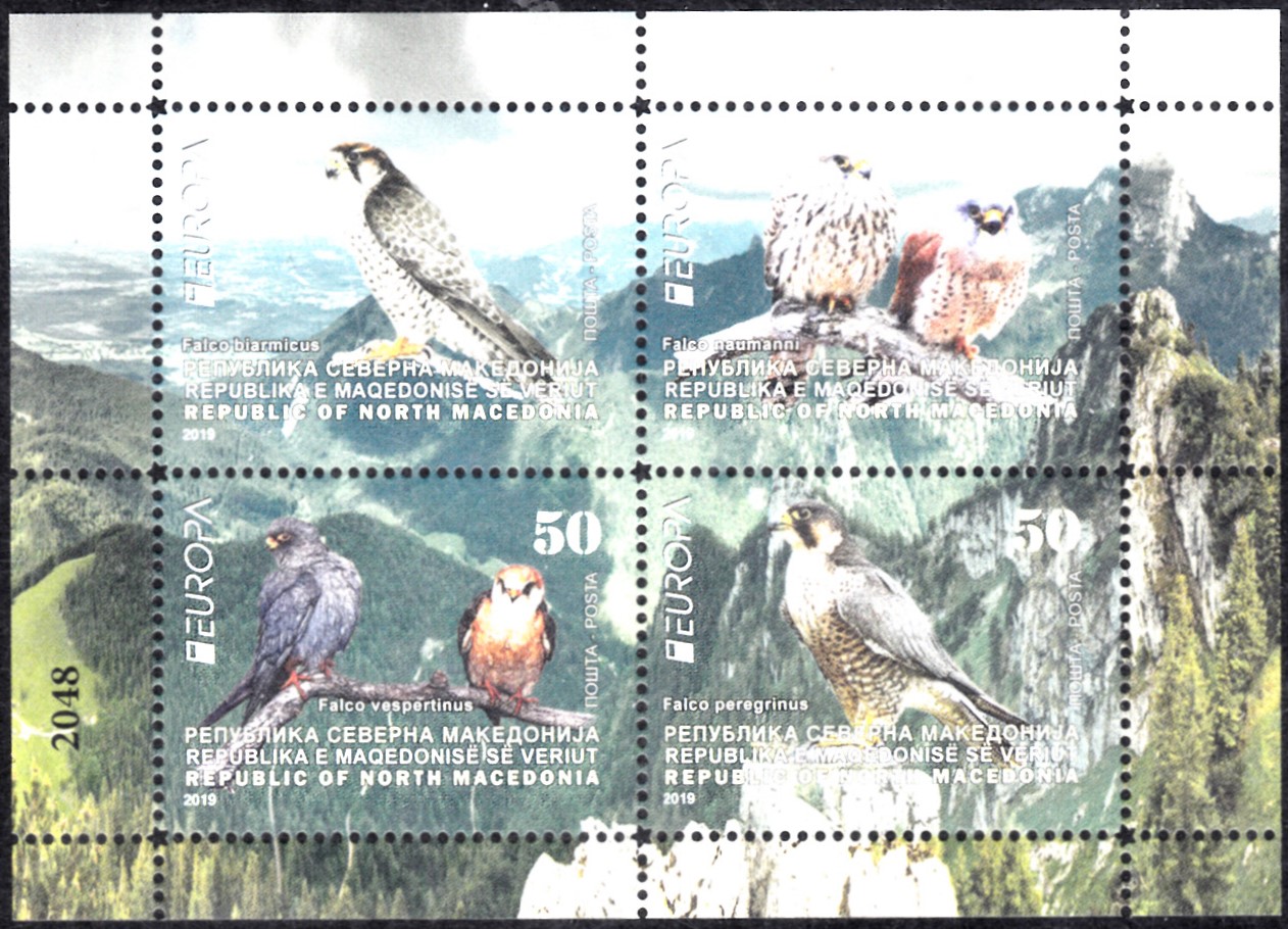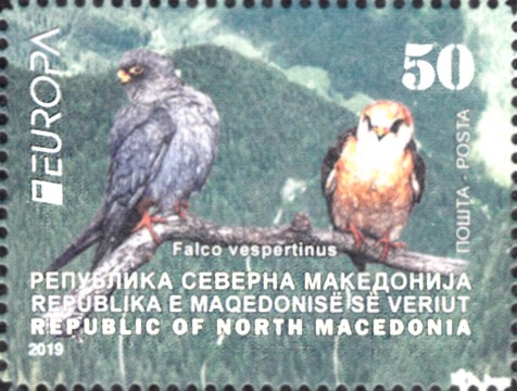 Die Europamarken 2019 sind in Nordmazedonien am 2. Mai 2019 zum Gemeinschaftsthema "Einheimische Vögel" erschienen. Hier zeige ich eine Marke zu 50 Denar aus einem Markenheftchen mit einem Rotfußfalkenpaar (Falco vespertinus). Die Auflage der Marke betrug 5 000 Stück.