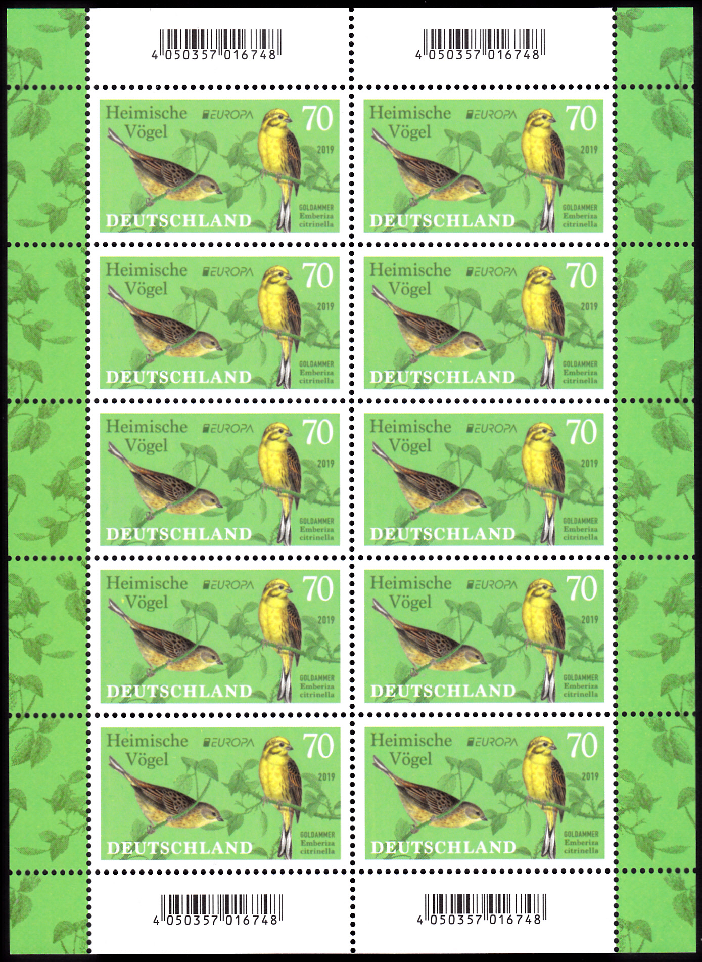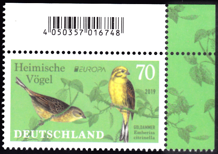 Die Europamarke 2019 ist bei der Deutschen Post am 2. Mai 2019 zum Gemeinschaftsthema "Einheimische Vögel" erschienen. Hier zeige ich die Marke zu 70 Cent mit einem Goldammerpaar als Eckrandstück mit EAN-Codierung.