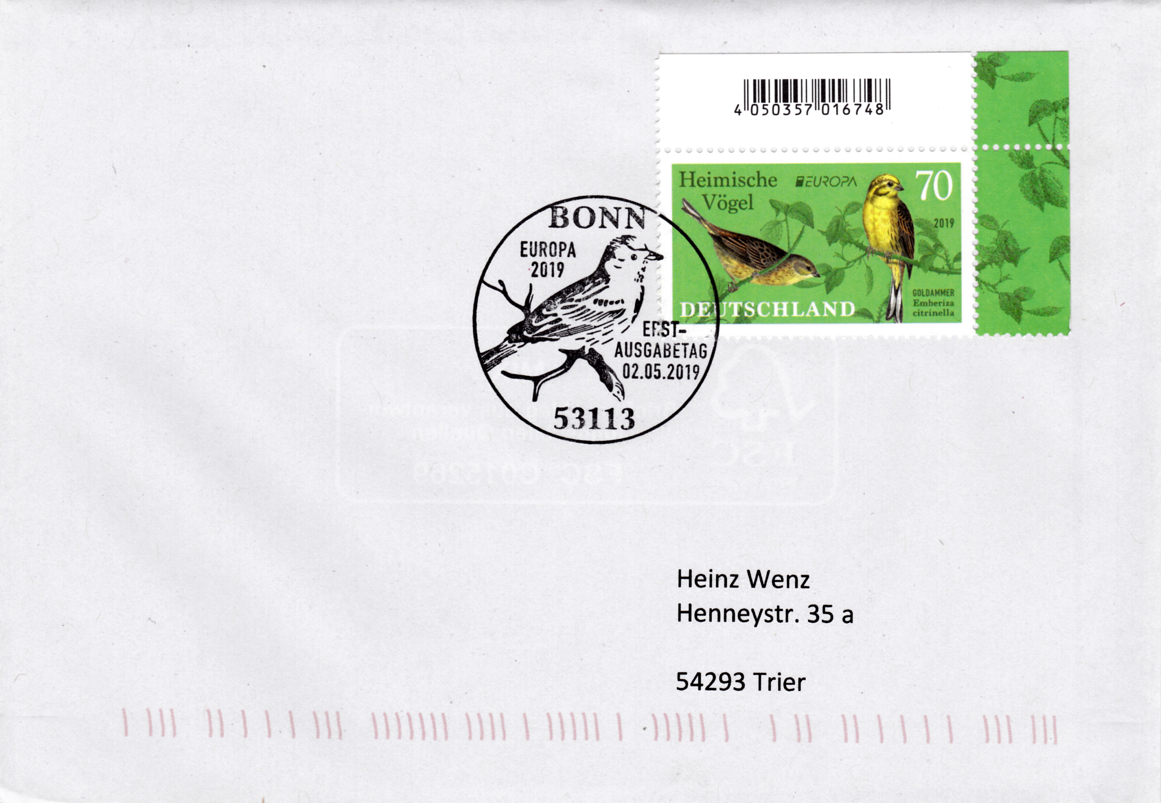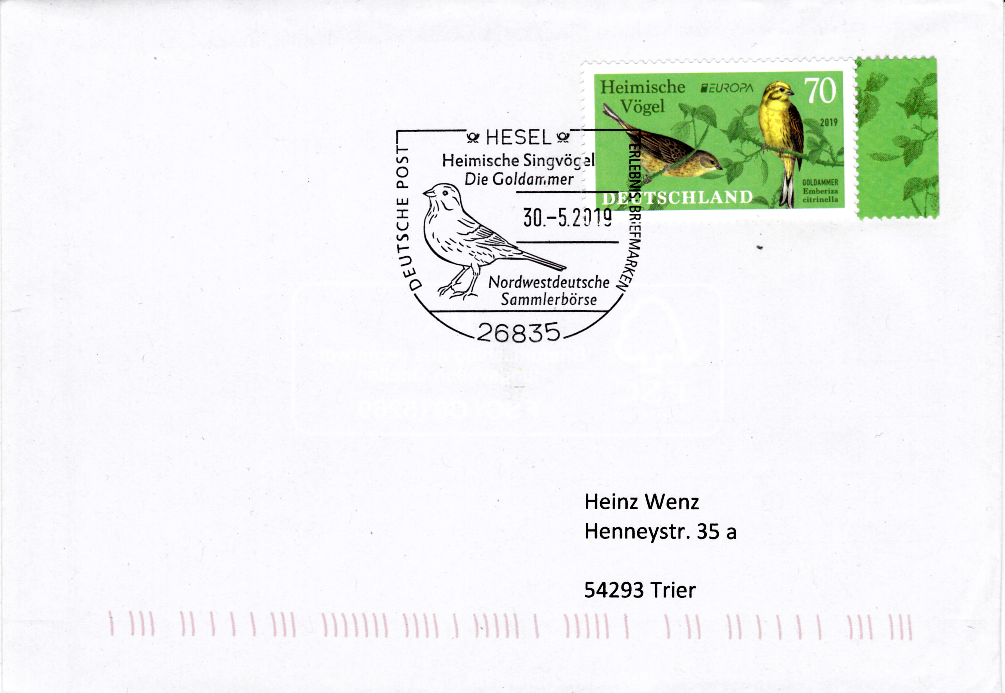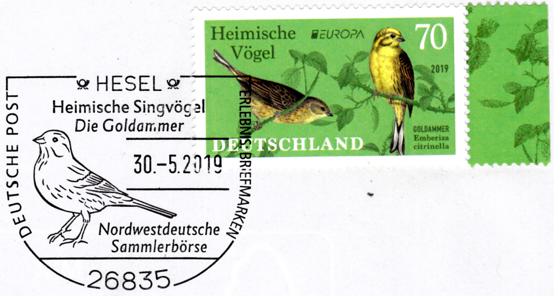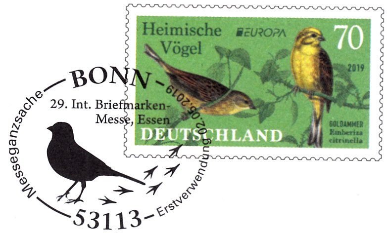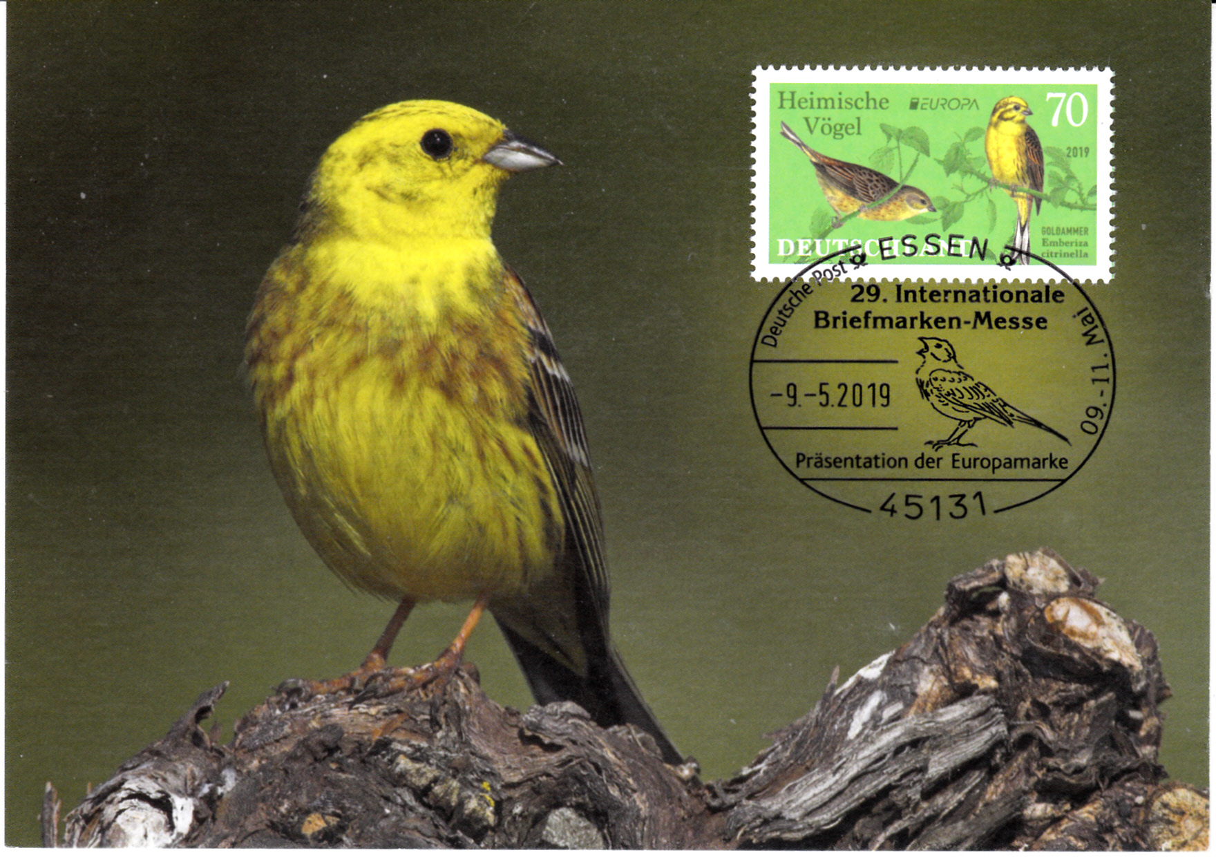 Zur Präsentation der Europamarke 2019 am 9.5.2019 bei der Briefmarken-Messe in Essen wurde ein Sonderstempel mit der Abbildung einer Goldammer eingesetzt. Dieser Stempel wurde hier zur Entwertung einer Marke auf einer von der Post verausgabten Maximumkarte verwendet.