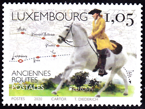 2020 sind in Luxemburg die Europamarken am 9. Juni 2020 zum Thema "Historische Postwege" erschienen. Hier zeige ich die Marke zu 1,05€ mit der Abbildung eines Postreiters nach einer Fotografie und eine Landkarte mit Strecken nach Italien.