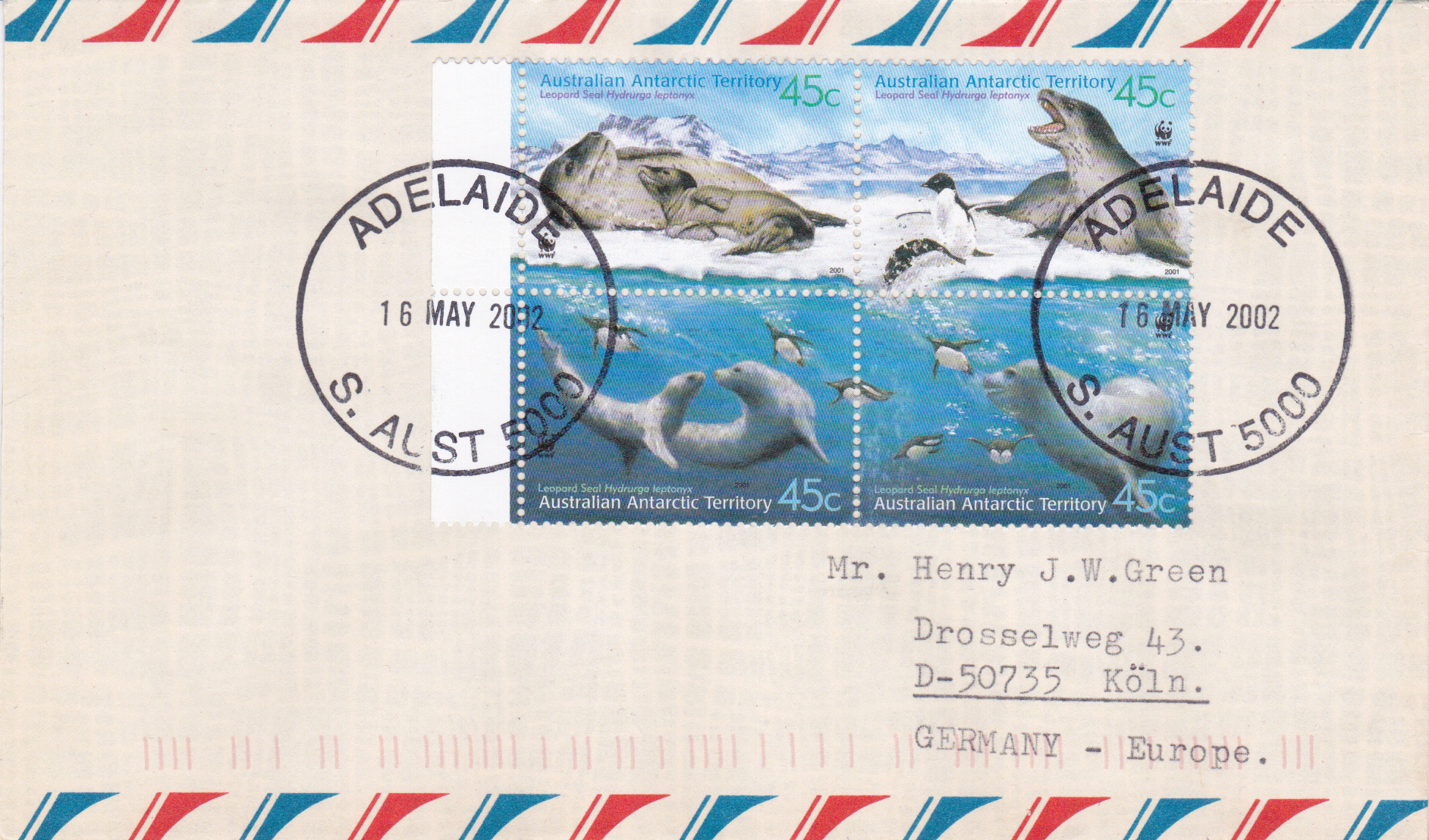 Auf diesem Luftpost-Brief von Adelaide nach Köln wurde der Viererblock als Frankatur verwendet.