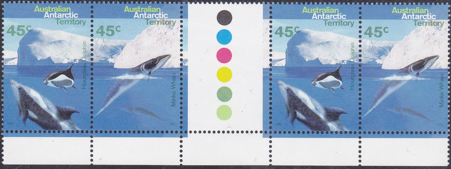Auf einer Marke der Australischen Gebiete in der Antarktis aus dem Jahre 1995 werden zwei Zwergwale gezeigt. Im Michel wird der Name Zwergwal (Balaenoptera acutorostrata) genannt, was der Nördlichen Zwergwal wäre. Da die Unterscheidung in Nördlicher Zwergwal (Balaenoptera acutorostrata) und Südlicher Zwergwal (Balaenoptera bonaerensis) erst seit 2000 anerkannt ist und beide Arten auch auf der Südhalbkugel vorkommen, kann es sich hier auf der Abbildung aber auch um den Südlichen Zwergwal (Balaenoptera bonaerensis) handeln.