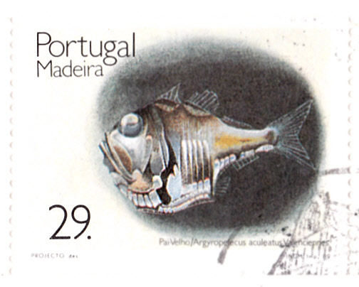 In einer Serie "Fische" aus Portugal-Madeira gibt es eine Marke (MiNr 129) mit einem Argyropelecus aculeatus. Bei Michel wird er Faltbauchfisch (Argyropelecus aculeatus) genannt.
