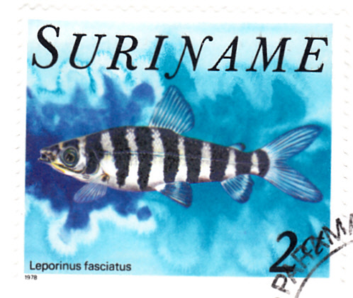 Diese Marke der gleichen Serie aus Surinam (MiNr 828) zeigt einen Gebänderten Leporinus (Leporinus fasciatus).