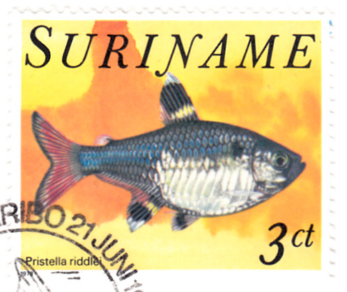 Diese Marke der gleichen Serie aus Surinam (MiNr 829) zeigt einen Sternflecksalmler (Pristella maxillaris). Bei Michel wird er Riddle-Sternflecksalmler (Pristella riddlei) genannt.
