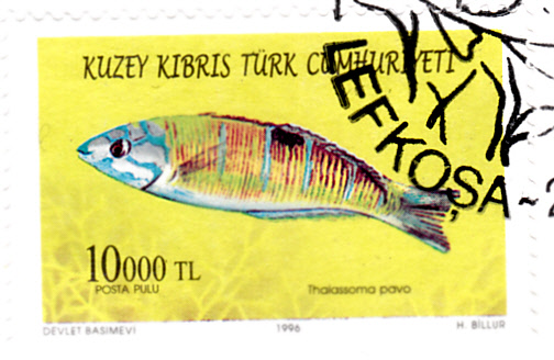 Auf einer Marke der gleichen Serie aus Türkisch-Zypern (MiNr 421) ist ein Meerpfau (Thalassoma pavo) zu sehen. Michel nennt ihn Pfauenjunker (Thalassoma pava).