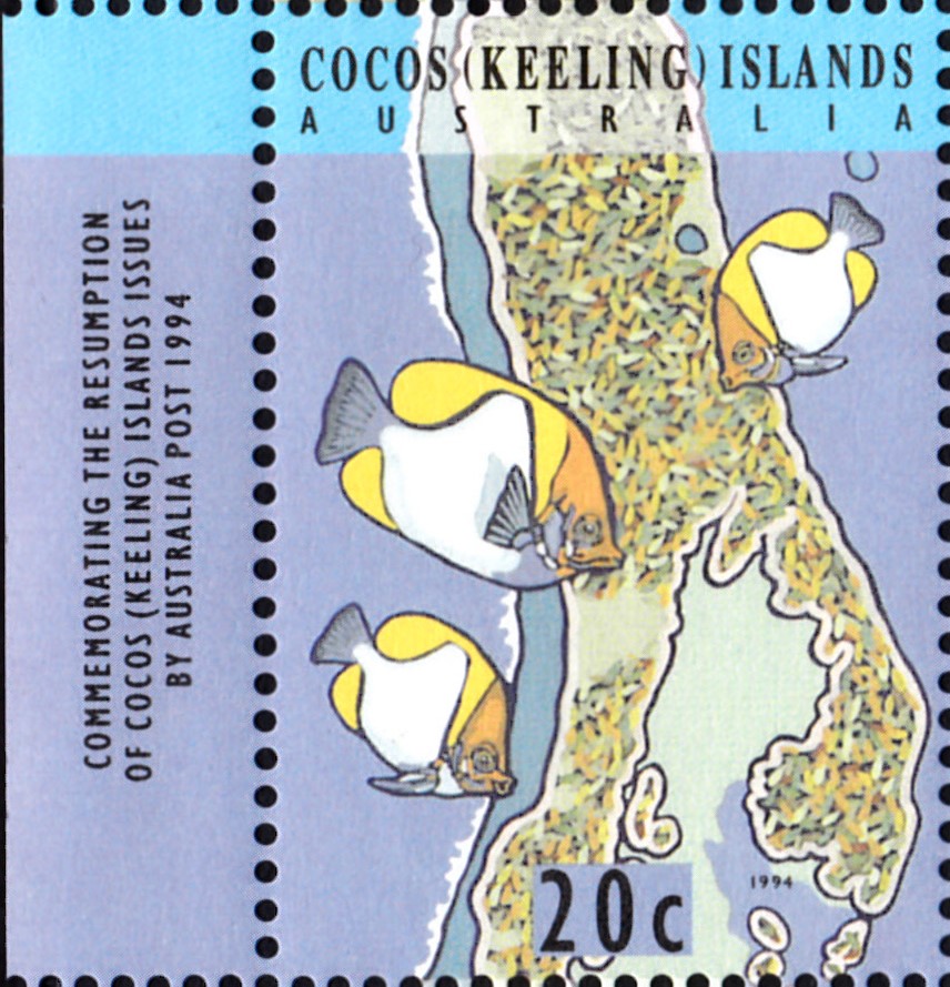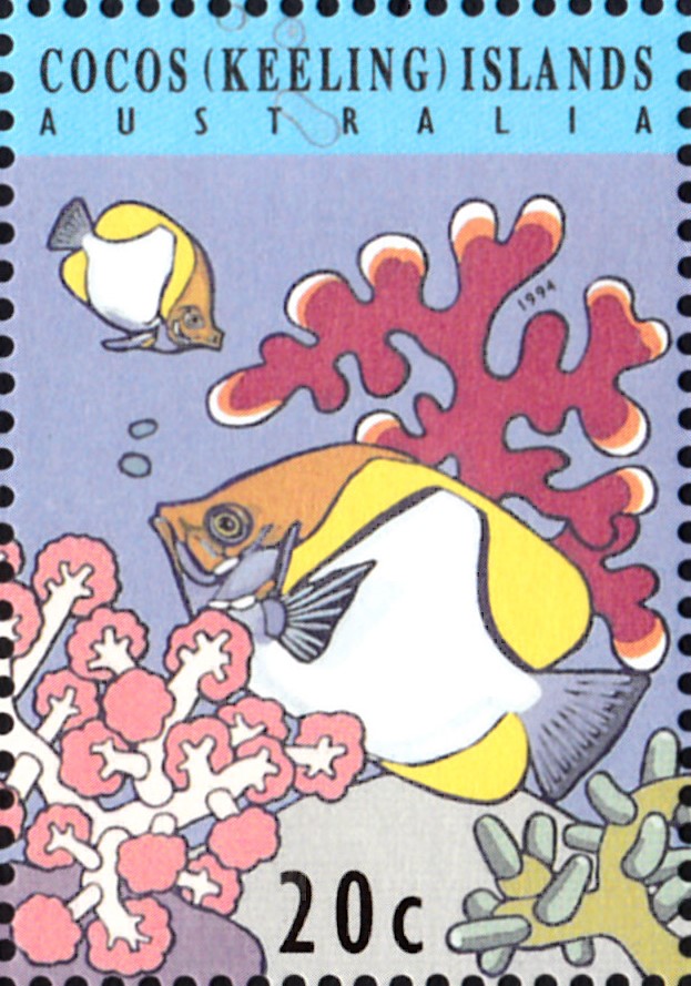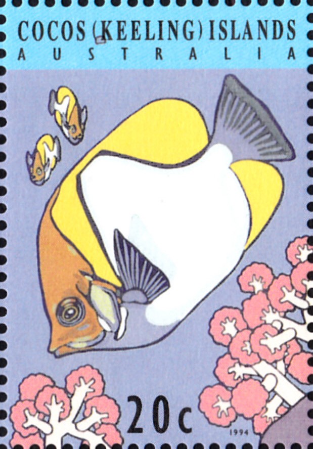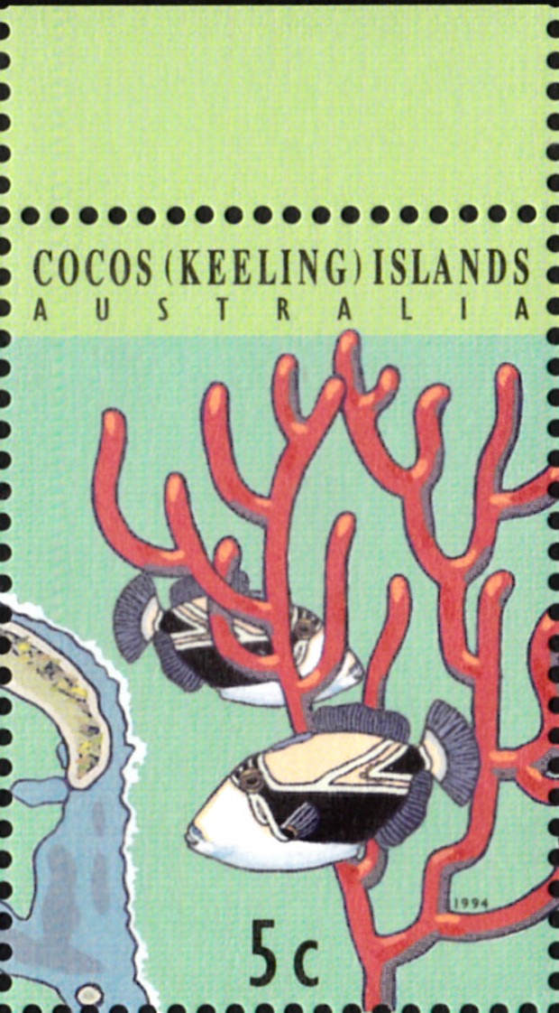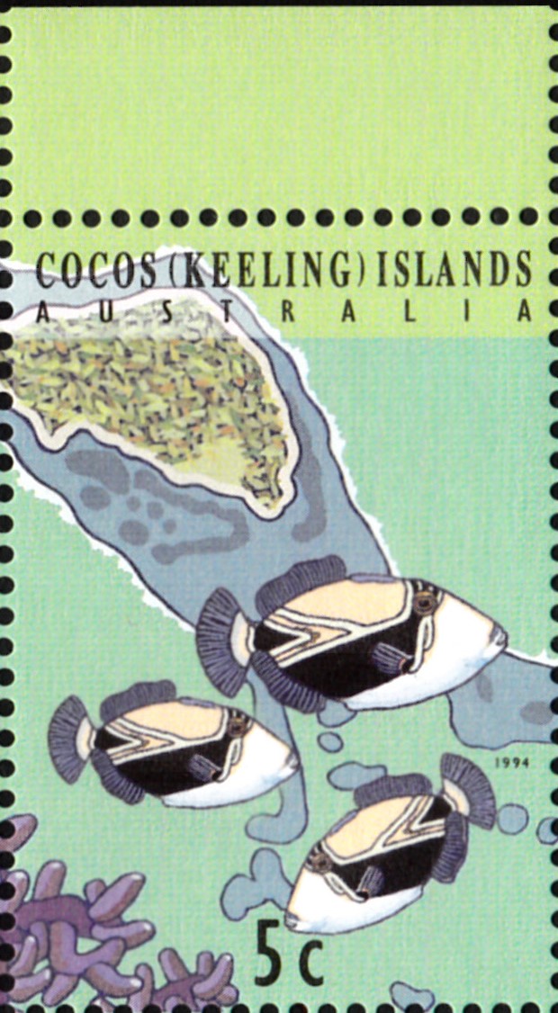 Auf den Kokos-Inseln sind Marken mit Diamant-Picassodrückerfischen (Rhinecanthus rectangulus) erschienen. Im Michel wird als Name Harlekin-Drückerfische (Rhinecanthus rectangulus) genannt. Hier eine der Marke (MiNr 305) mit zwei dieser Fische.