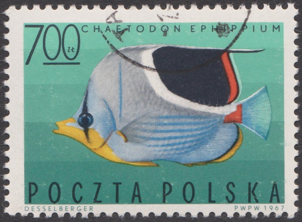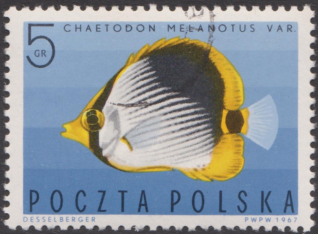 Dieses Postwertzeichen Polen MiNr. 1754 zeigt ein Exemplar der Art Arabischer Rippen-Falterfisch = Chaetodon melapterus: