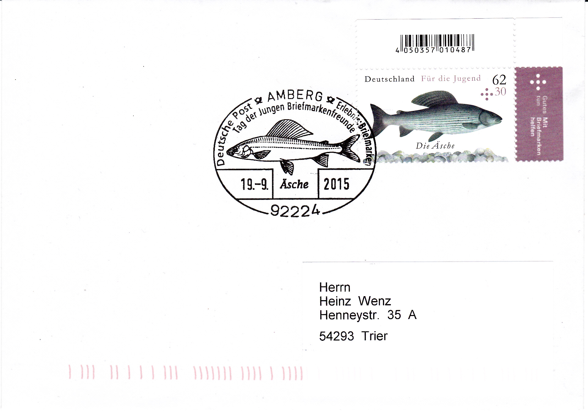 Sonderstempel zum Tag der Jungen Briefmarkenfreunde am 19.9.2015 in Amberg mit der Abbildung einer Äsche, passend zu dem Motiv der 62+30 Cent Marke der Jugendmarken 2015.