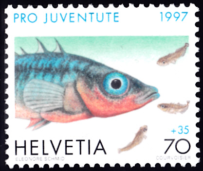 Auf dieser Marke der Schweiz (MiNr 1630) wird ein Dreistachliger Stichling (Gasterosteus aculeatus) gezeigt.