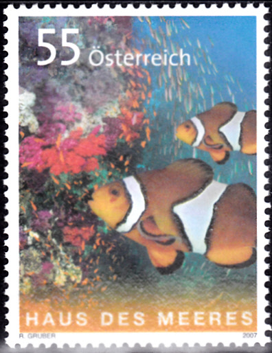 Auf dieser Marke aus Österreich (MiNr 2694) zum Jubiläum 50 Jahre Haus des Meeres in Wien werden Falsche Clownfische (Amphiprion ocellaris) gezeigt.