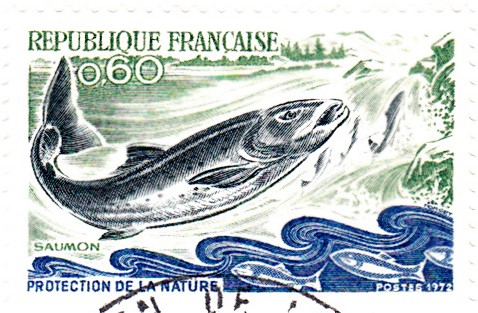 Lachse sind auf dieser Marke (MiNr 1794) aus Frankreich eine zum Thema "Umweltschutz" eine Marke (MiNr 1794) abgebildet.
