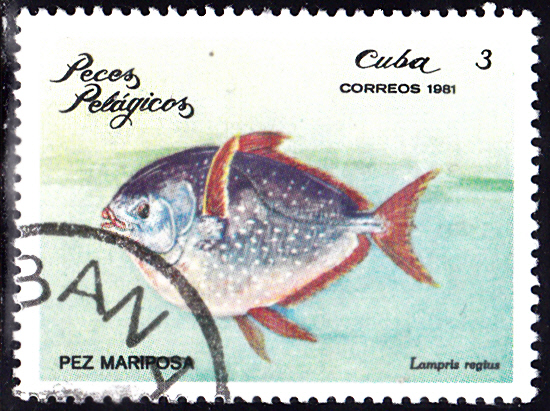 Eine Marke aus Kuba (MiNr 2202) zeigt einen Feuermaulbuntbarsch (Thorichthys meeki).