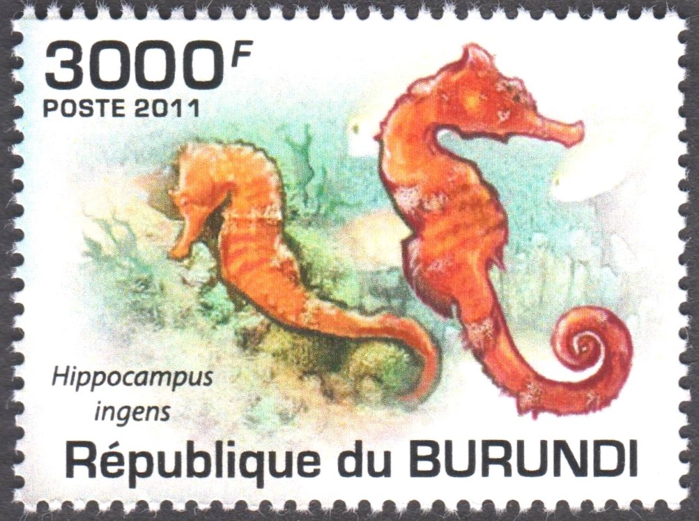 Dieses Postwertzeichen aus Burundi zeigt Seepferdchen: