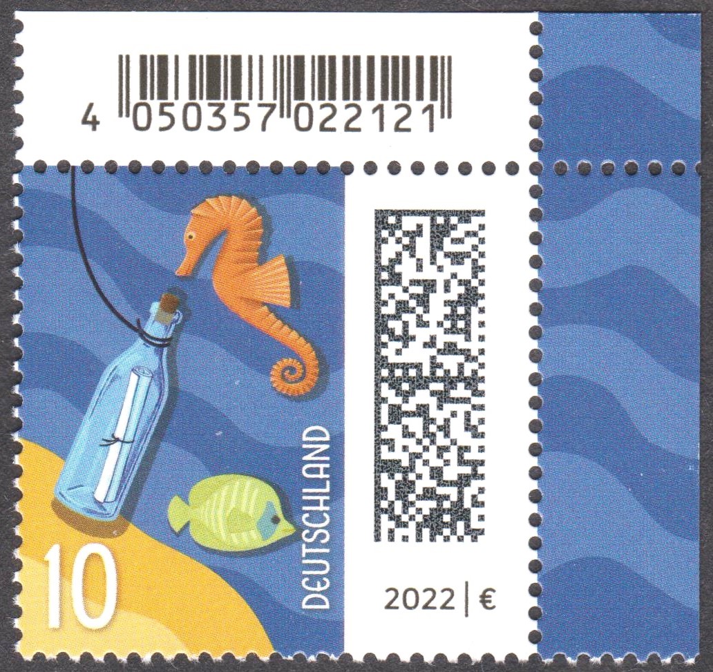 Die Marke zu 10 Cent der Freimarkenserie "Welt der Briefe" (MiNr 3723) mit dem Motiv "Flaschenpost mit Rotem Seepferdchen (Hippocampus kuda) wurde auch in Rollen zu je 200 Stück gedruckt. Jede 5. Marke der Rolle ist rückseitig nummeriert, auf diese folgt ein Zwischenfeld mit EAN-Codierung.