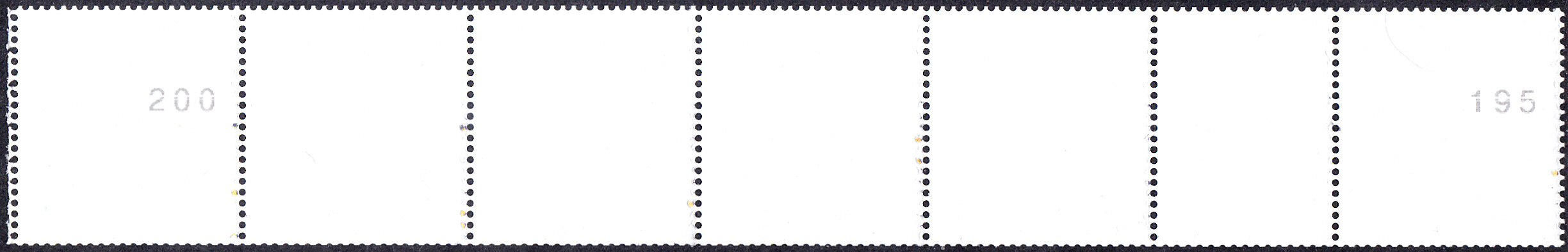 Hier zeige ich einen Streifen von sechs Marken und einem Zwischenfeld mit EAN-Codierung vom Rollenanfang (Marke Nummer 200).