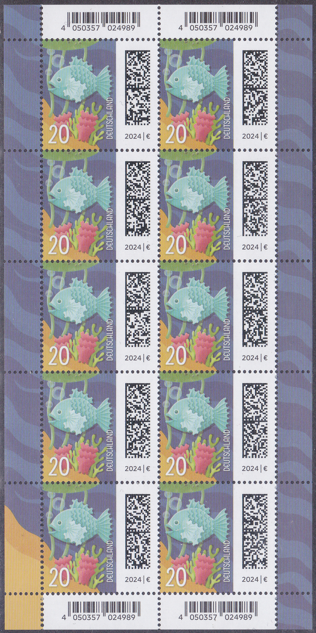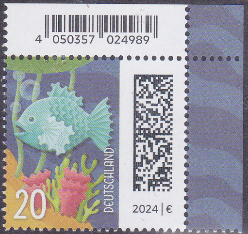Am 2. November 2024 ist eine Marke zu 20 Cent mit dem Motiv "Blaugelber Zackenbarsch (Epinephelus flavocaeruleus) mit Briefmarken-Flossen" erschienen. Hier zeige ich eine Marke vom Eckrand mit EAN-Codierung.
