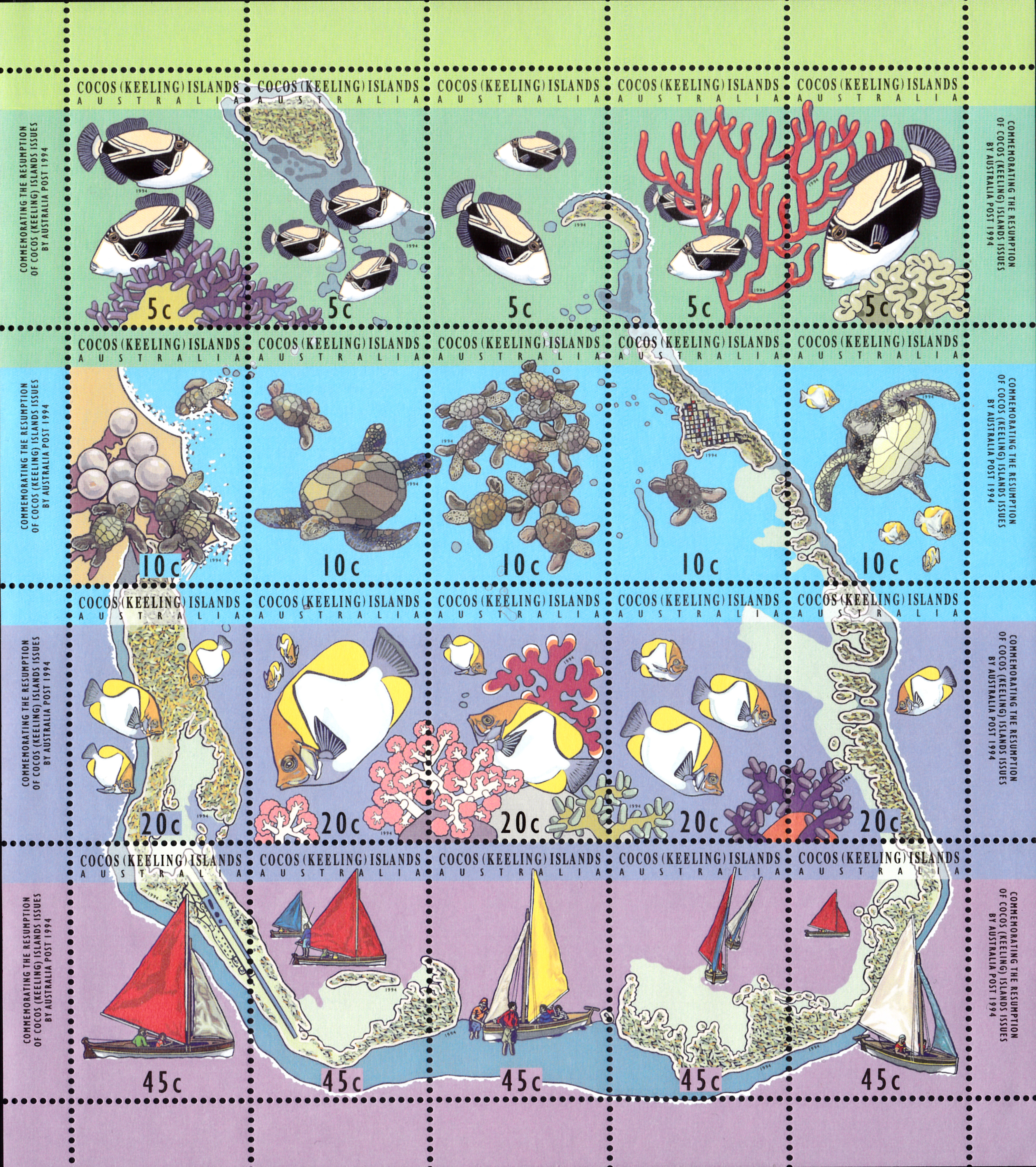 Die gezeigten Marken der Kokos-Inseln sind zusammen mit weiteren Marken zusammenhängend in einem Bogen gedruckt worden. Hier zeige ich auch den kompletten Bogen mit insgesamtb20 verschiedenen Marken. Auf dem Bogen ist auch eine Landkarte der Kokos-Inseln zu sehen.