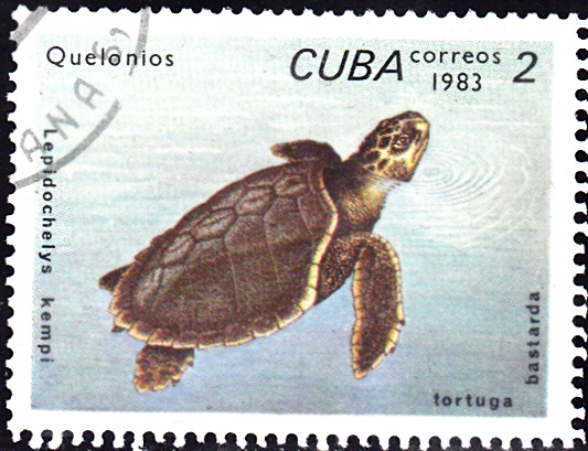 Auf dieser Marke aus Kuba (MiNr 2767) wird eine Atlantik-Bastardschildkröte oder Karibische Bastardschildkröte (Lepidochelys kempii) gezeigt. Michel nennt als Name Kemp-Bastardschildkröte Lepidochelys kempii.