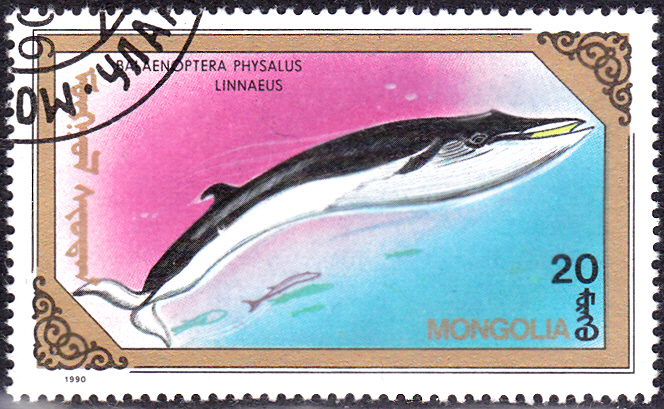 Aus der Mongolei kommt diese Marke (MiNr 2141) mit einem Finnwal (Balaenoptera physalus).