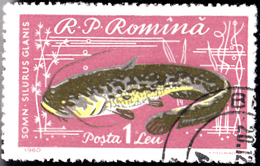 Diese Marke aus Rumänien (MiNr 1731) zeigt einen Flusswels (Silurus glanis) im Markenbild.