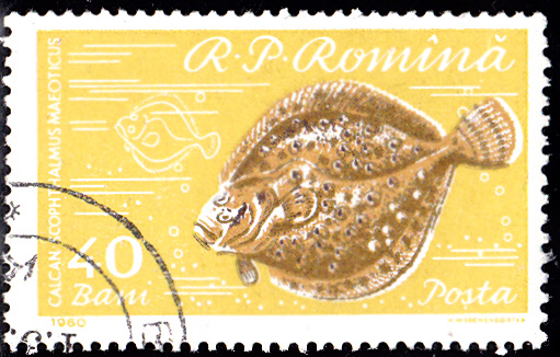 Diese Marke aus Rumänien (MiNr 1929) bildet zeigt einen Schwarzmeer-Steinbutt (Scophthalmus maeoticus).