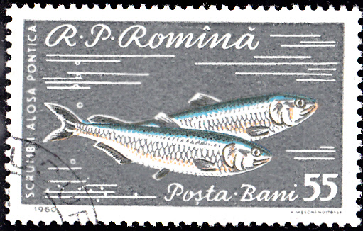 Auf dieser Marke aus Rumänien (MiNr 1930) sind zwei Schwarzmeer-Alsen (Alosa pontica) aus der Gattung Aloso zu sehen.