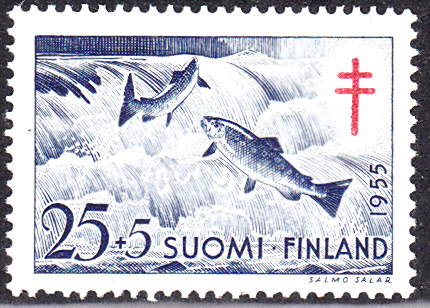 Diese Marke aus Finnland (MiNr 445) zeigt zwei Atlantische Lachse (Salmo salar).