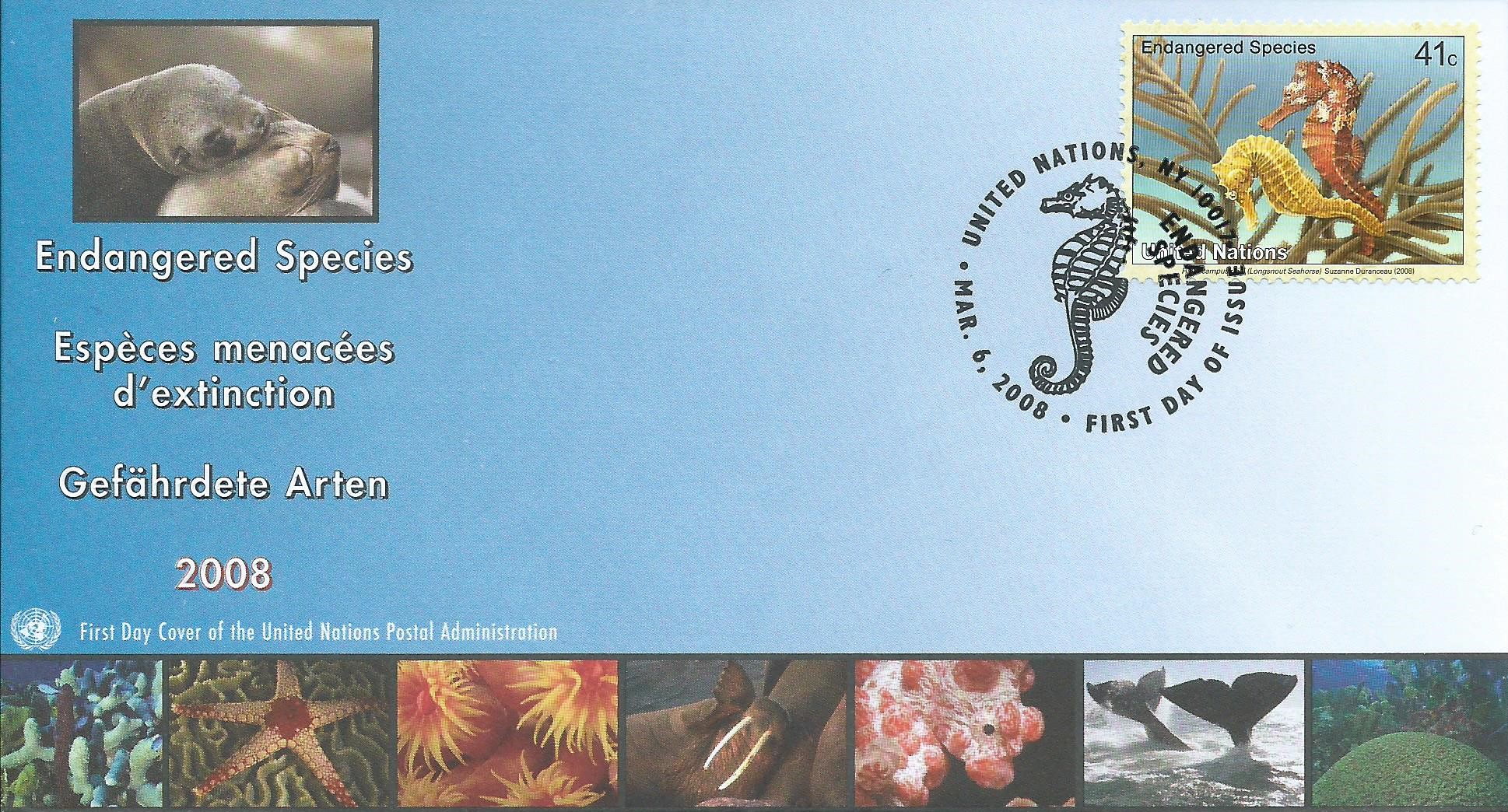 hier ein schöner Beleg mit einer Marke mit Motiv Seepferdchen. Herausgegeben wurde sie von den Vereinten Nationen am 6.3.2008 und mit entsprechendem Ersttagsstempel entwertet.