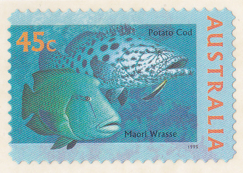 Es folgt die Marke (MiNr 1519) mit dem Gefleckten Riesenzackenbarsch (Epinephelus tukula, Syn.: Epinephelus fuscoguttatus, Serranus dispara, Serranus fuscoguttatus; engl.: Potato Cod) und dem Napoleon-Lippfisch (Cheilinus undulatus; engl.: humphead wrasse, Māori wrasse, Napoleon wrasse, Napoleon fish oder Napoleonfish.