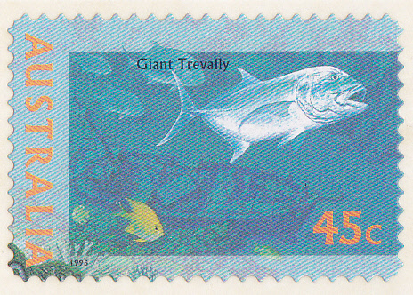 Hier zeige ich die selbstklebende Marke (MiNr 1520) mit der Dickkopf-Stachelmakrele (Caranx ignobilis; engl.: giant trevally, giant kingfish, lowly trevally, barrier trevally, ulua, oder nur kurz "GT").