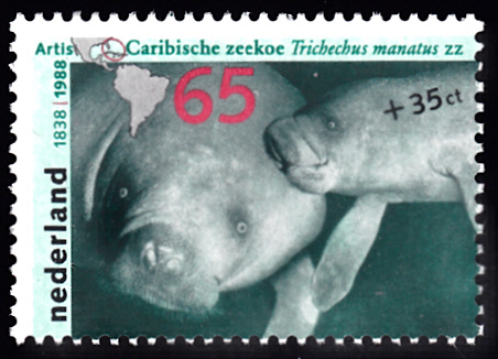 Auf dieser Marke aus den Niederlande (MiNr 1340) wird ein Karibik- oder Nagel-Manati (Trichechus manatus), eine Seekuhart aus der Familie der Rundschwanzseekühe (Trichechidae), mit einem Jungtier gezeigt.