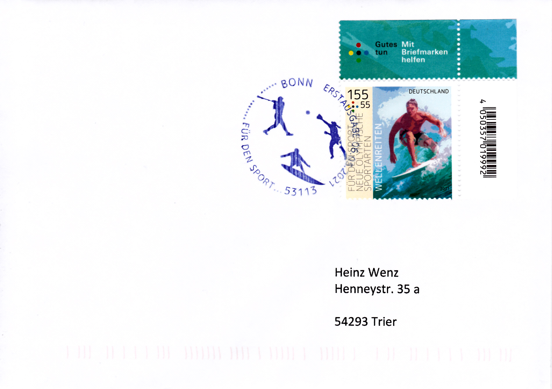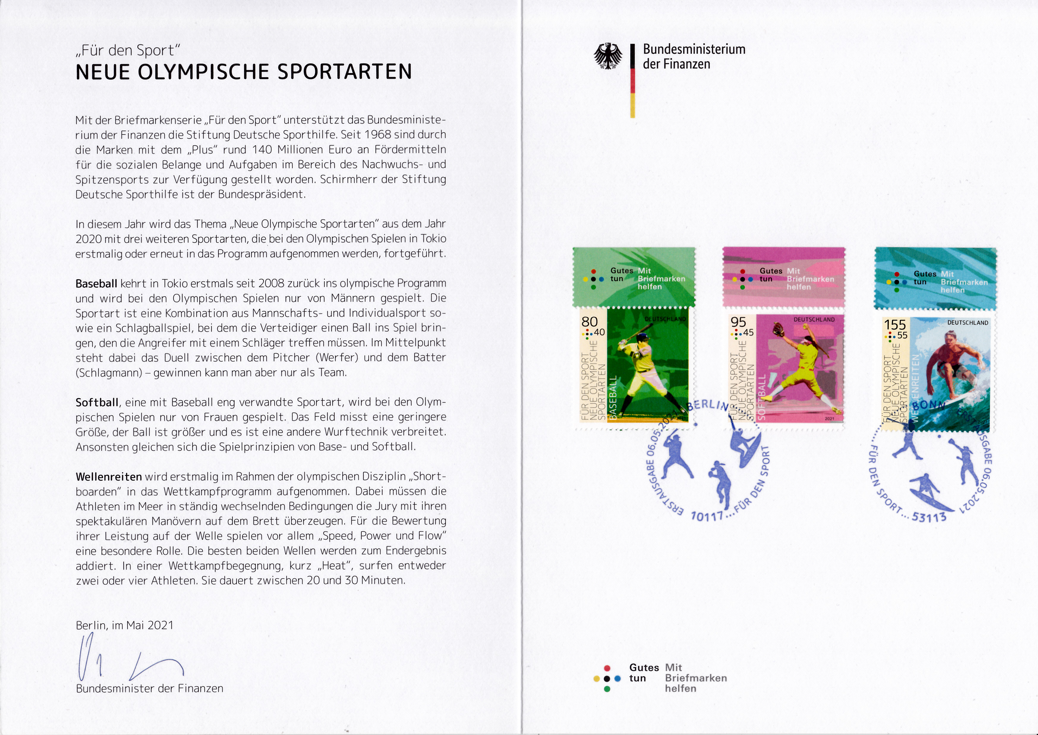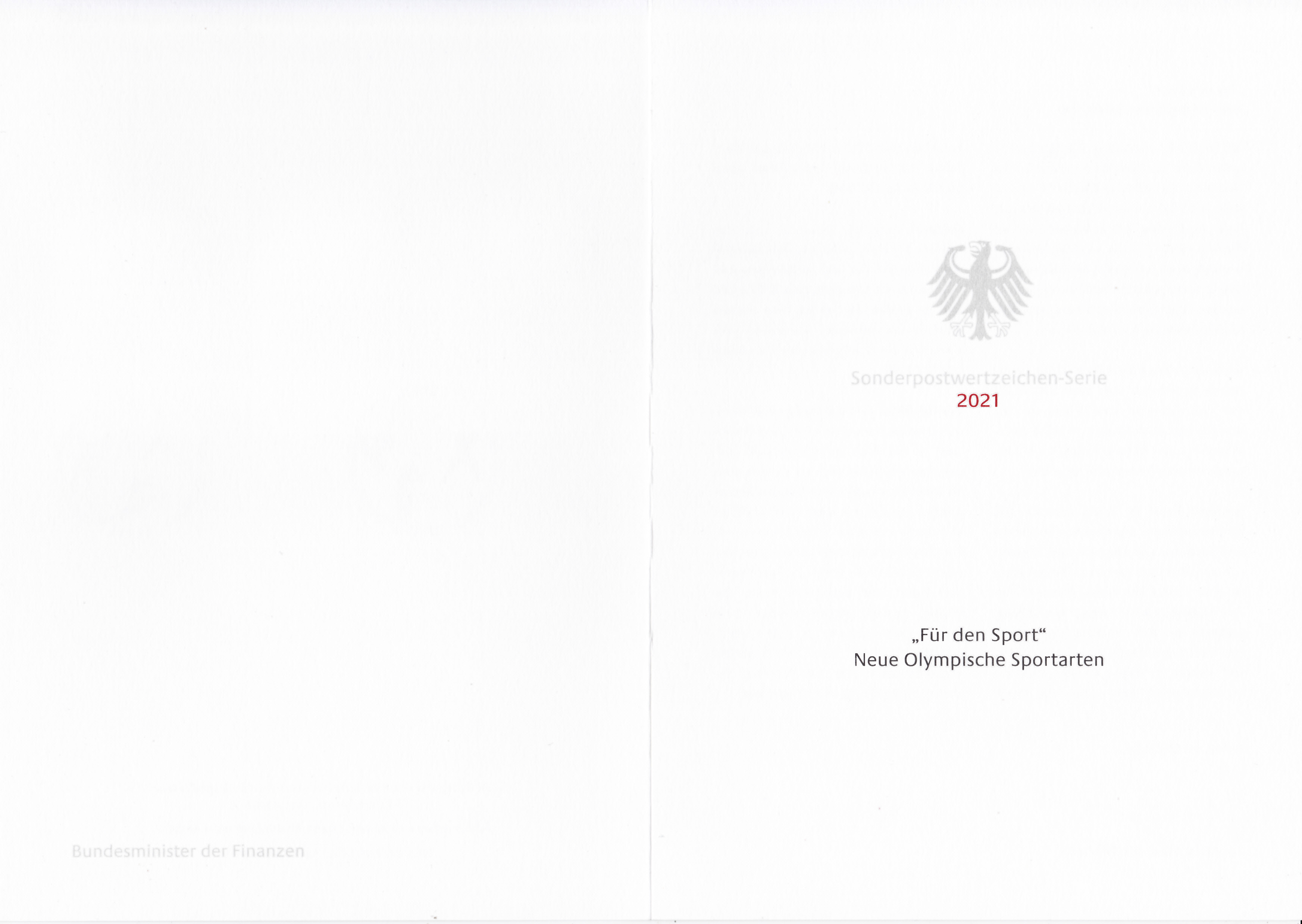 Farbige Ministerkarte des Finanzministers mit den Marken für die Sporthilfe 2021 (MiNr 3602 bis 3604) mit Motiven zu "Neue olympische Sportarten". Zwei Marken sind mit den Ersttagsonderstempel Berlin gestempelt und eine Marke erhielt den Ersttagsonderstempel Bonn.